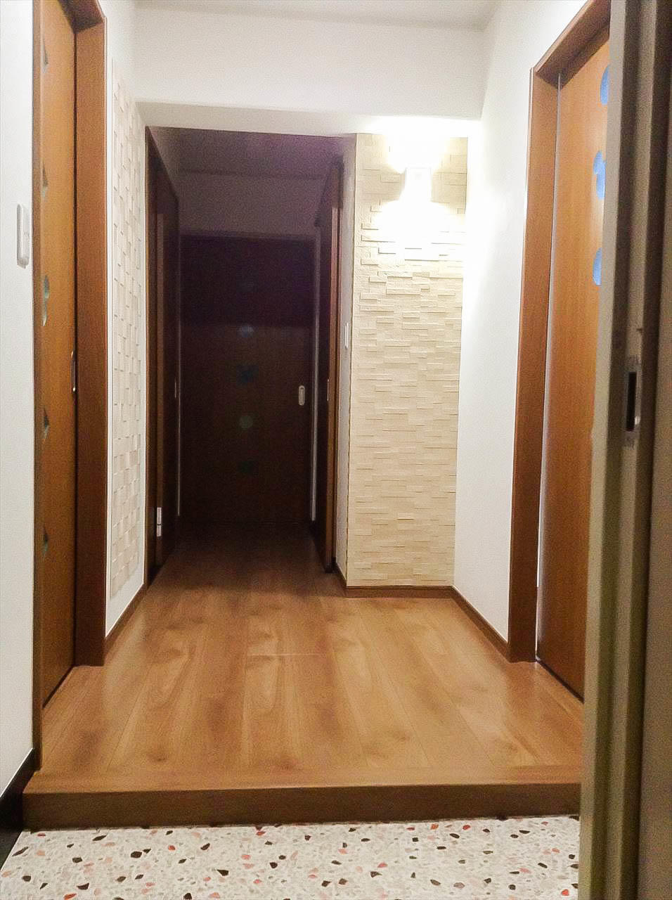 スペースを広くとるために、玄関収納を奥に引っ込めて高さのあるミラー付きの下駄箱にしました。また、玄関の壁正面と側面にエコカラットを貼りおしゃれになりました。