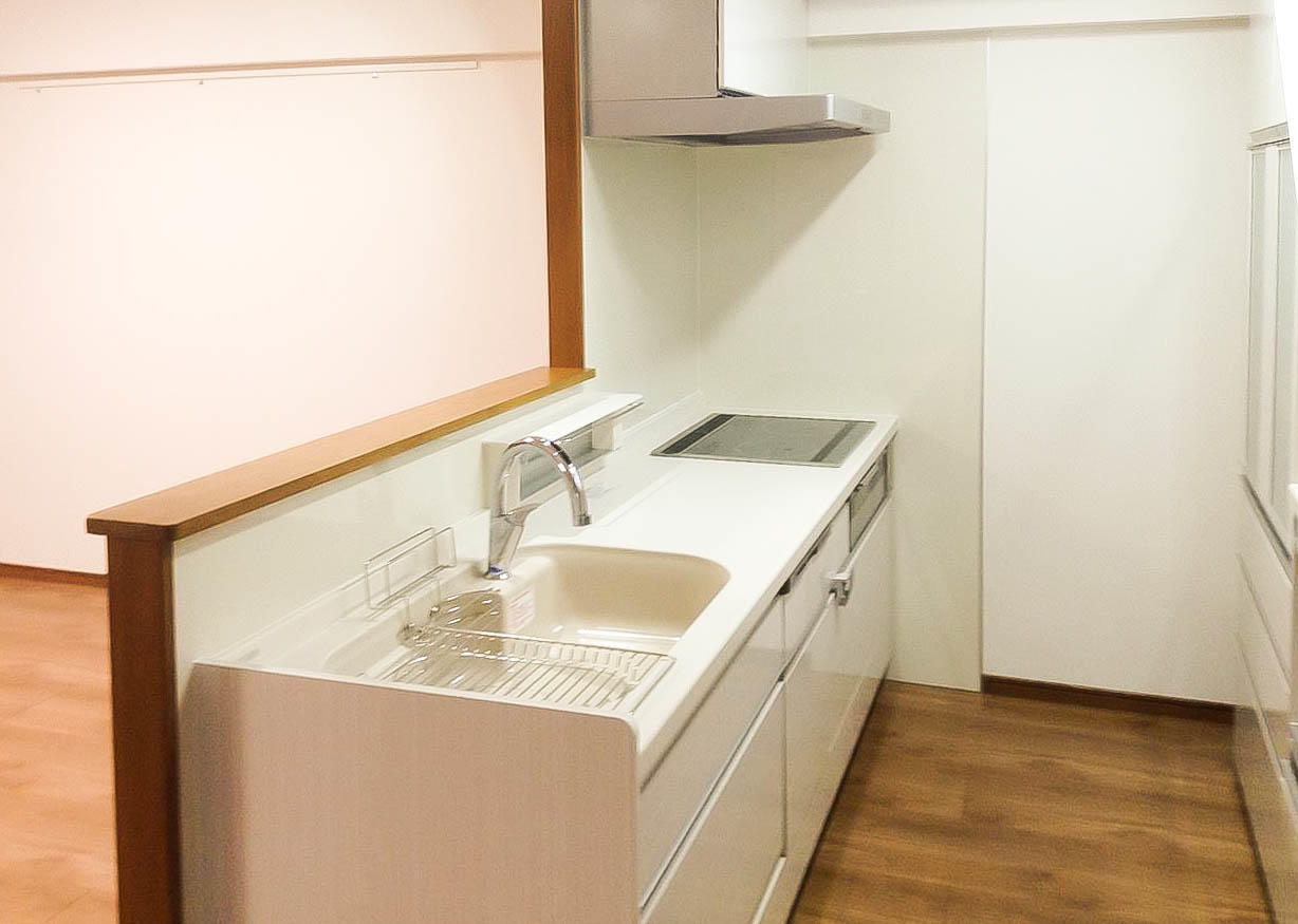 孤立していた壁付のキッチンを対面キッチンに改装し、ガスコンロからIHに、水栓はタッチレス式になりました。機能も収納もしっかり備えたキッチンになりました。