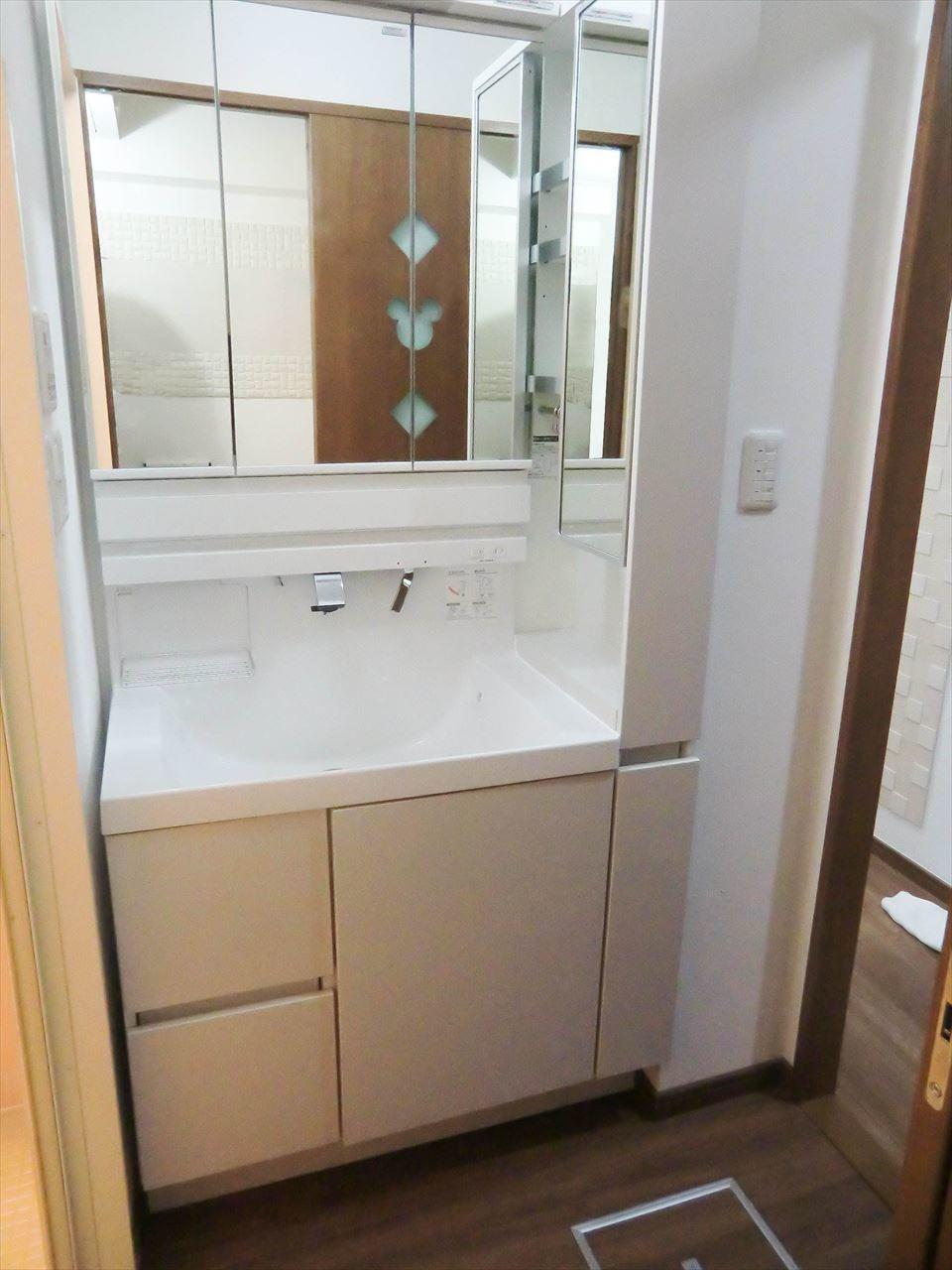 洗面台は壁にピッタリサイズで機能性の高いLIXILのエルシィを採用。