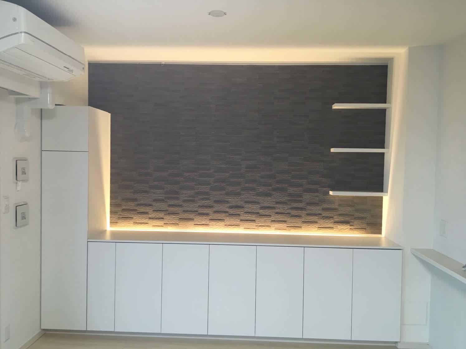 今回の工事はエコカラットとクロスの張替えから始まったのですが、 お打ち合わせを繰り返すたびにお客様の憧れの内装にしたい願望が強くなられていきショールームの様な内装作りになっていきました。 最終的にお客様にも大変喜んでいただきました。 ありがとうございました。