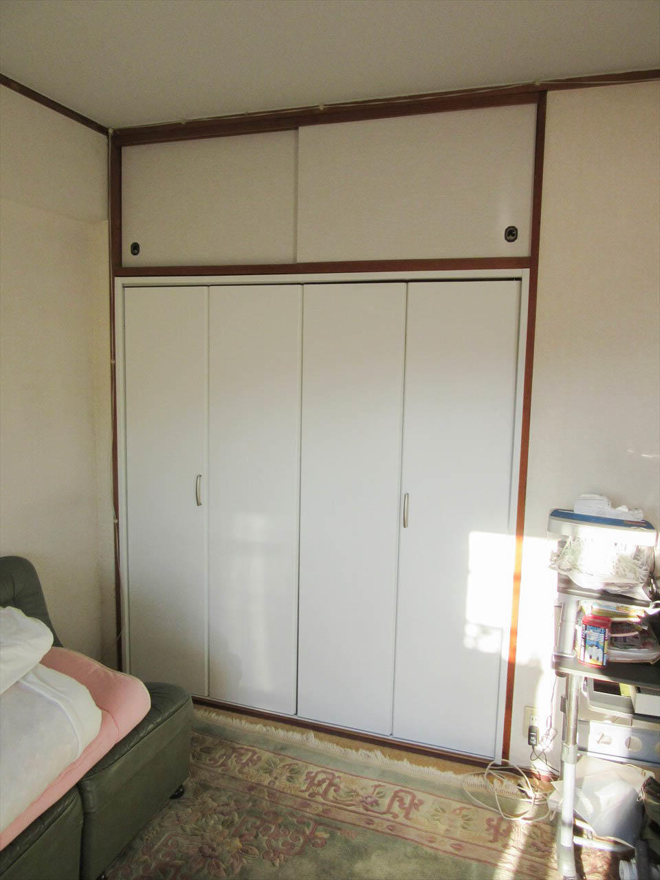 レンジフード・ガスコンロ・キッチンのクッションフロア・中間キャビネットは汚れが目立ってきたためご相談を頂きました。また、クロスは剥離している部分が多く、押入れは襖ですと開口部に制限があるので、お布団の出し入れに苦労してたそうです。