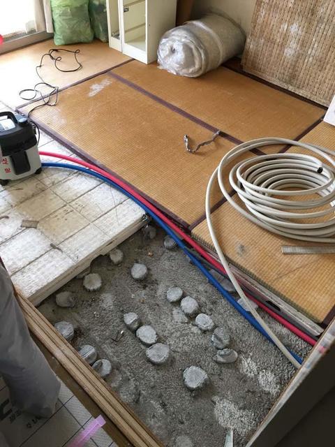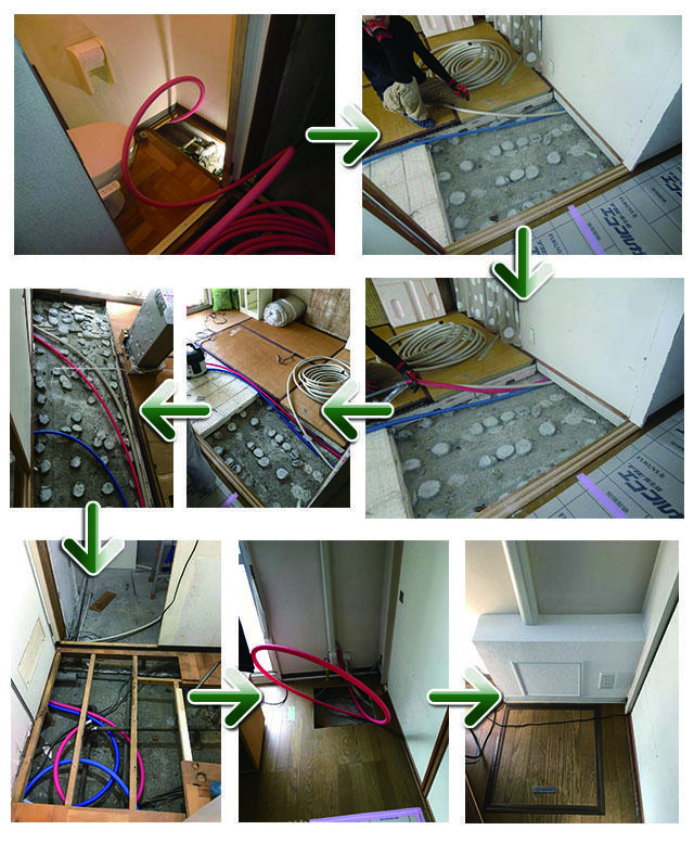 ガーデンタウンでの給湯管交換と給湯器を外に出す工事は何度も行っているので職人達も慣れたものです。床下にポリエチレン管を通し最小限の開口で施工出来ます。