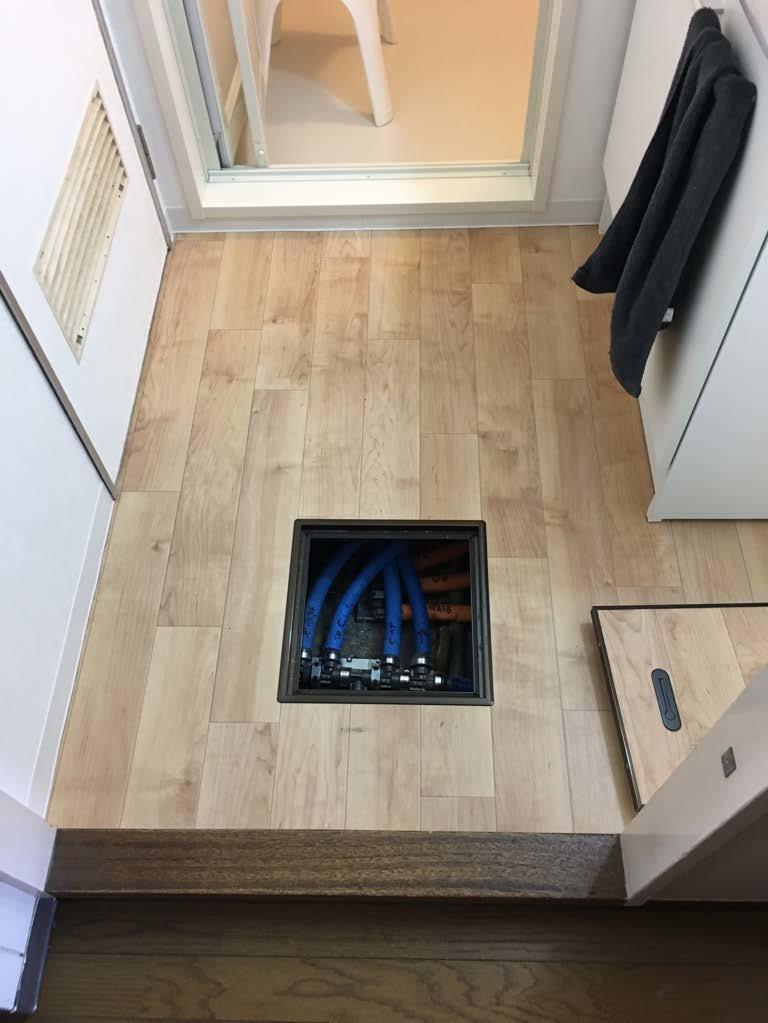 洗面台もLIXILのオフト(間口75cm)にリフォームして床のクションフロアーを貼り替えました。また、床に点検口を新設した事により、点検口を開けるとヘッダーシステムが見えて点検する事ができます。ブルーが給水管 オレンジが給湯管でそれぞれ何処に繋げてあるか記入してあります。これで何かあった時も安心ですね。