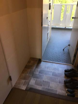 最後に玄関の土間はキレイなフロアータイルに貼り替え、壁にエコカラットを貼り完成です。