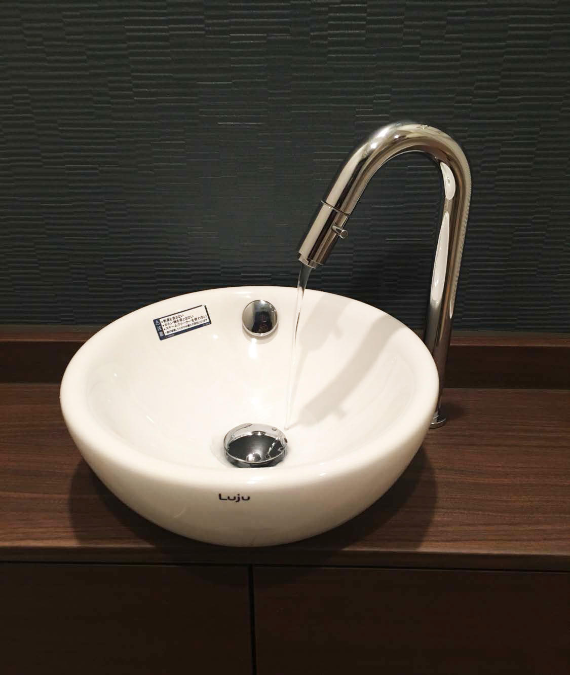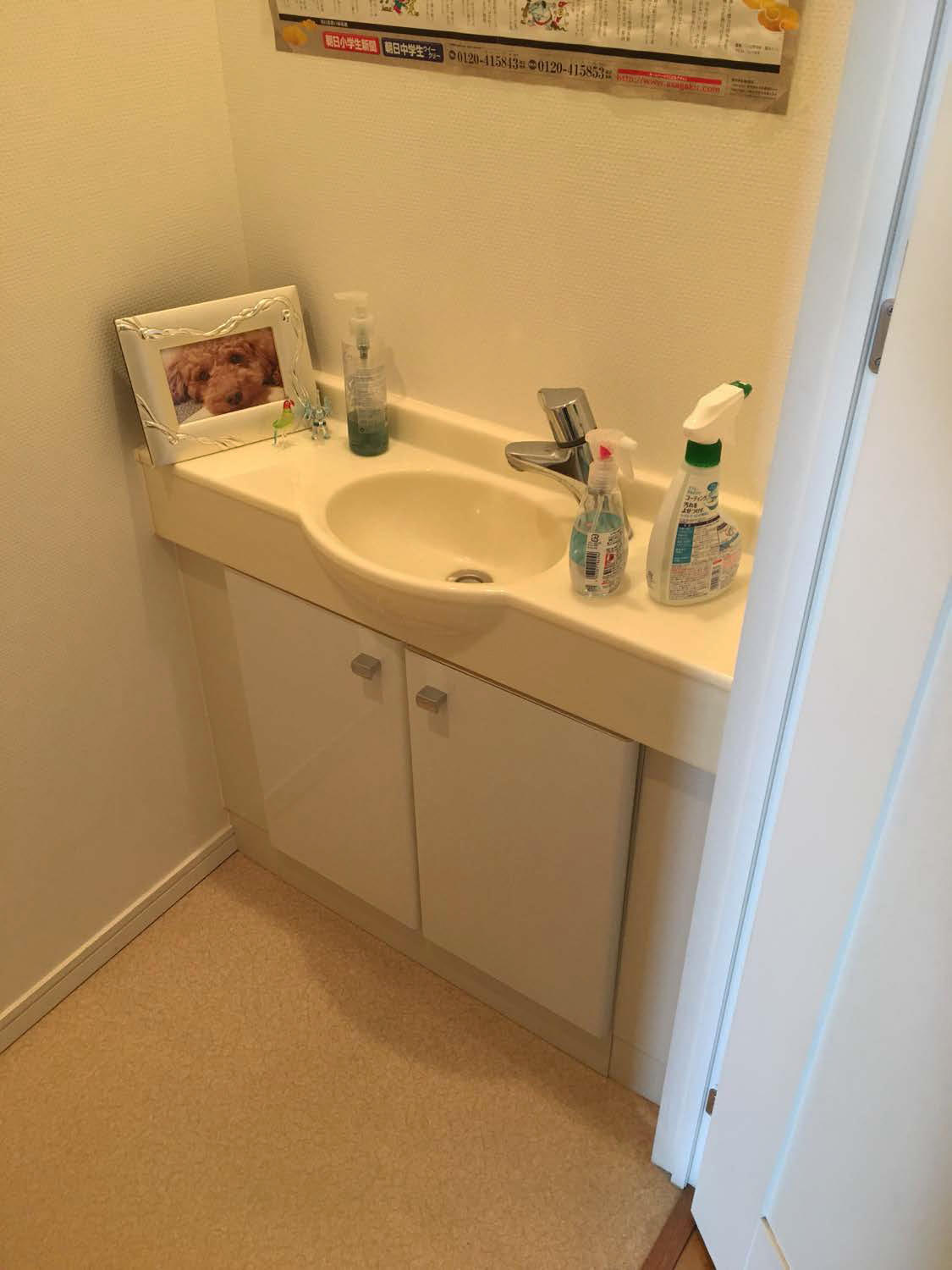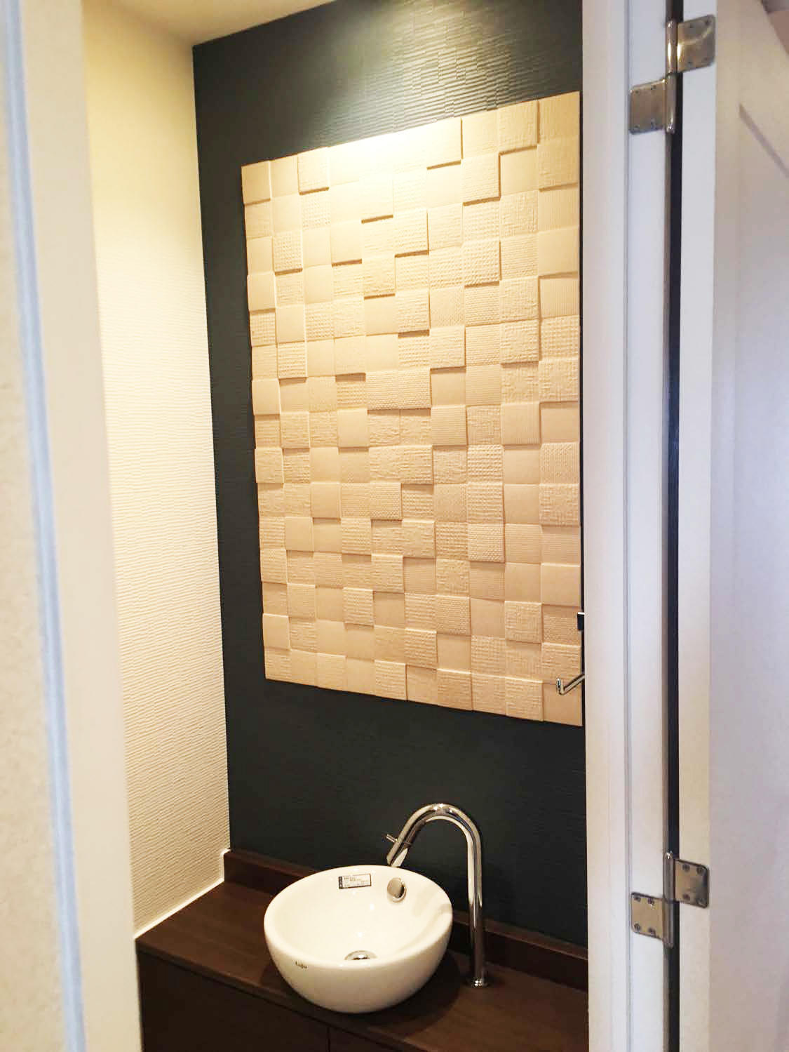 マンションの最初から付いていた手洗い器でしたが、 コンパクトでどのメーカーにも合うサイズが無く、 大建工業の水回りカウンターとカクダイの手洗い器を組み合わせ造作しました。 そしてエコカラットを貼り完成です。 アクセントクロスのみよりもエコカラットの印影が出て絵が飾ってあるような位上がりになります。