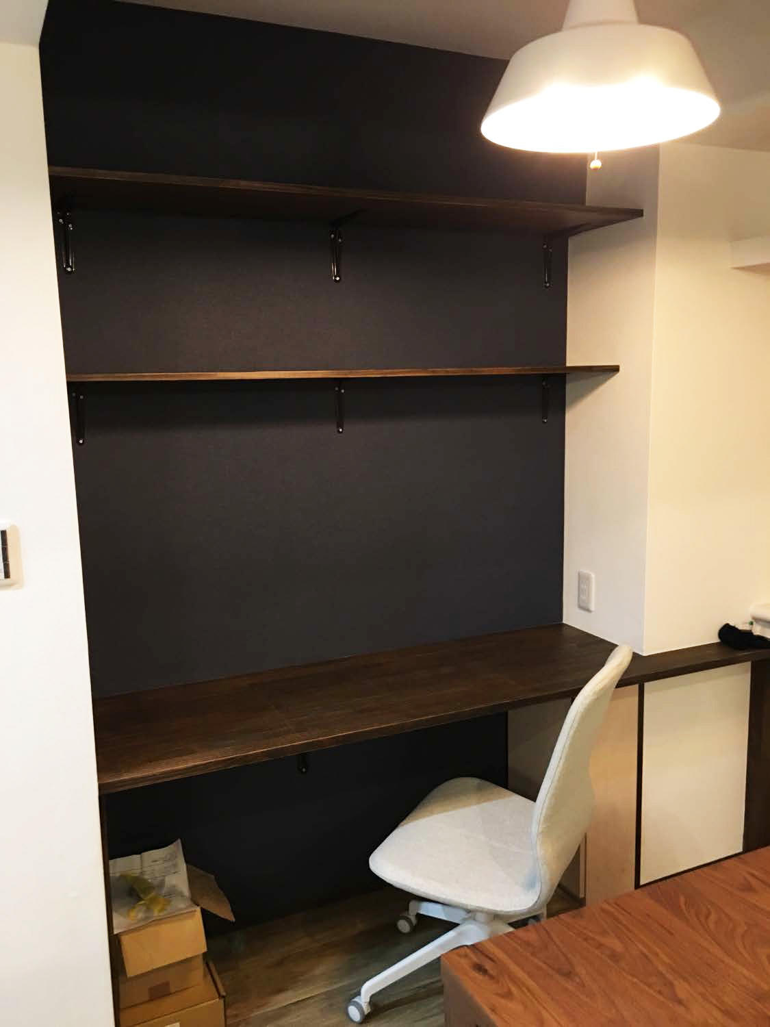 PCデスクも造り付けにし、さらにモデムやルーターなどは隠してあります。配線が見えないのですっきりですね。