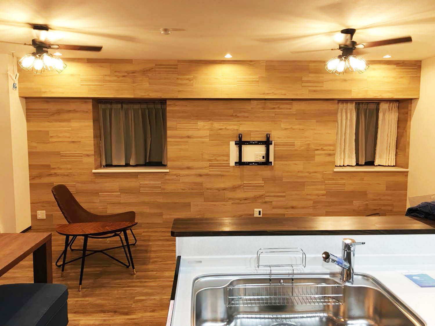 床のフロアータイルと壁のエコカラットを同色で合わせました。家具もお洒落な家具をお選びになっていてお家にとても合っています。