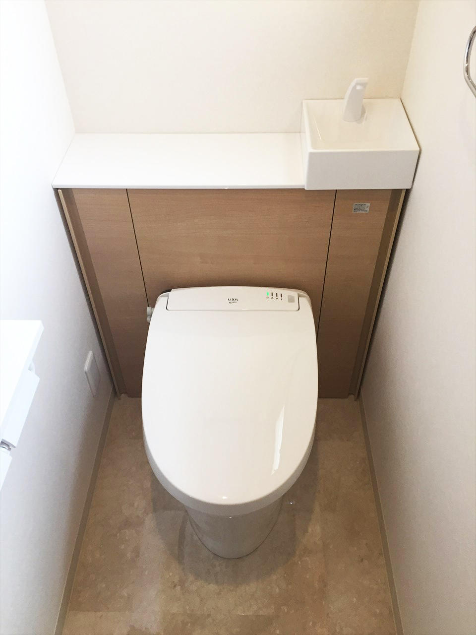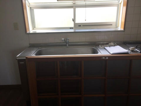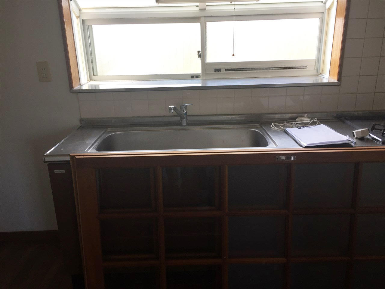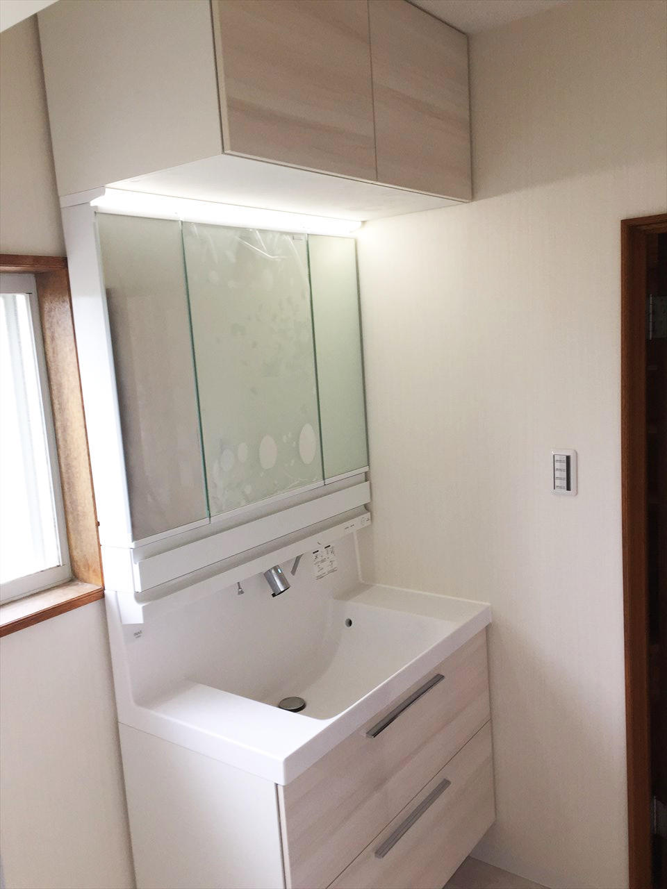 キッチンも既存と同様のI型のシエラ2550サイズでキッチンを明るく見せるため、近年人気の白の木目調クリエアイボリーの扉色にしました。 扉カラーハイグレードでエルシィ一番人気のカームウッドライト色。キッチンの扉色の近似色を持ってきて、キッチン共に床も明るいホワイト基調のフロアタイルに。