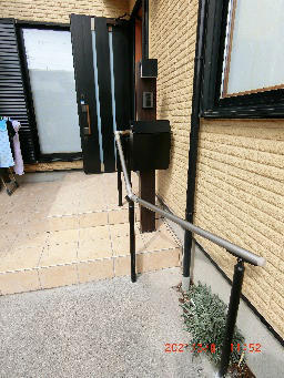 S様からは高齢のお母様の為にアプローチに手摺りを設置して、床タイル張り替え、機能門柱、玄関収納、玄関照明交換の依頼をされました。