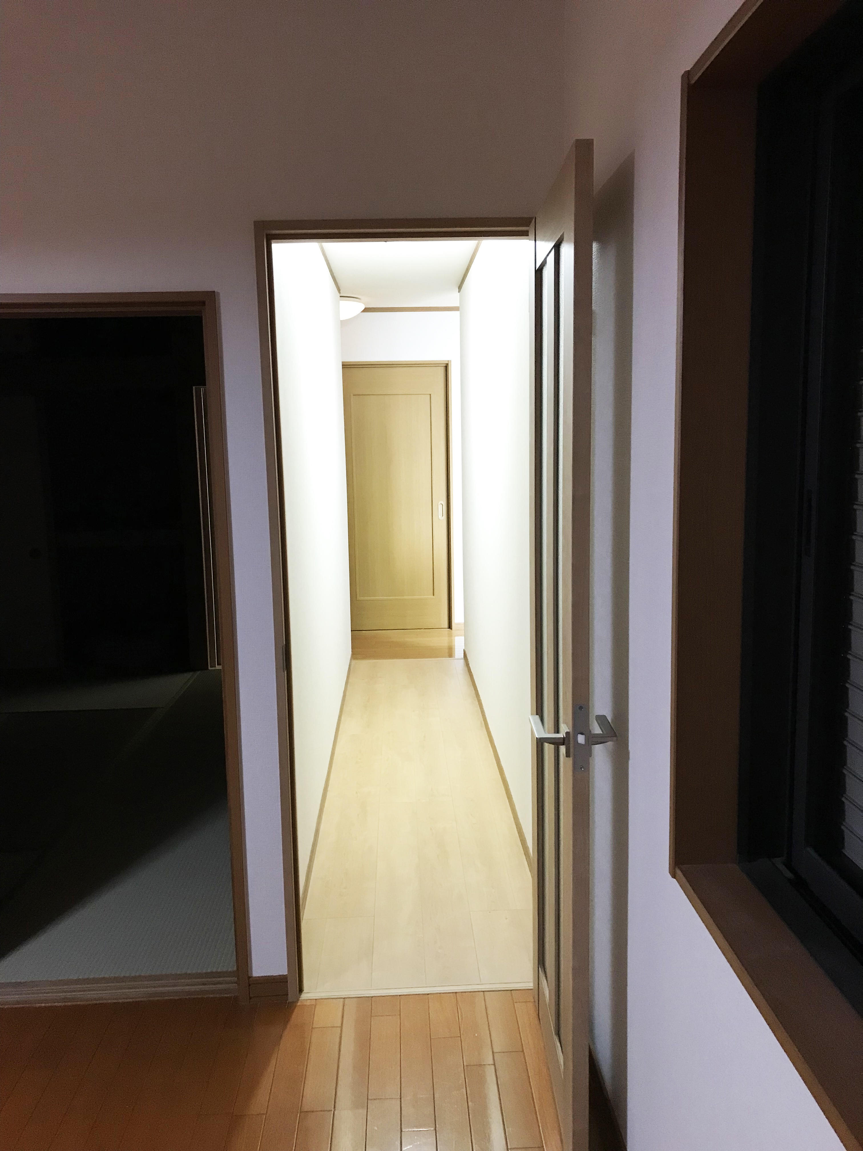 天井を除く全クロスを交換したため、新築の雰囲気が出ました。 将来を見据えて、医療用カーテンの間仕切りをつけ、 歪んでいた玄関扉の調整でしっかりと閉まるようになり、喜んで頂ける仕上がりとなりました。