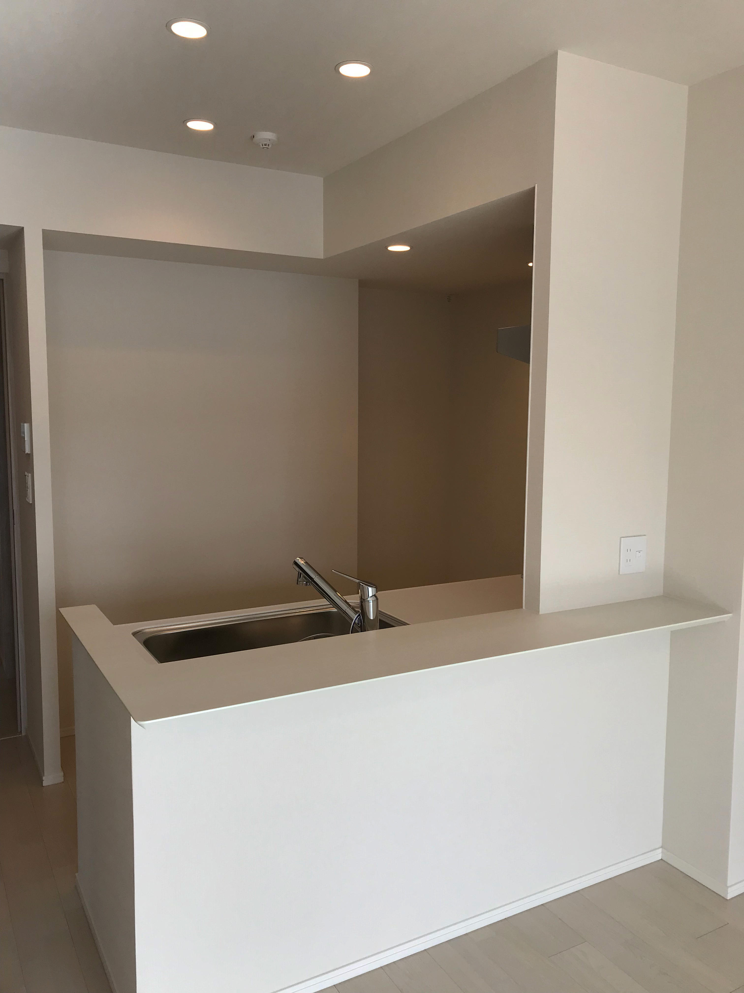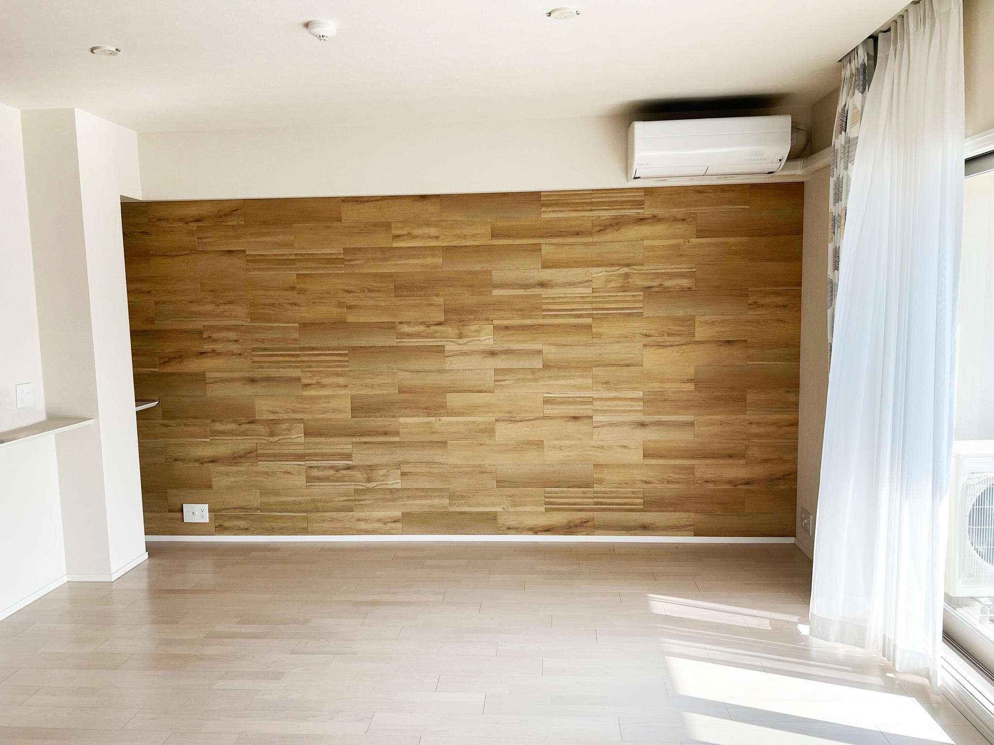 新築マンションのため、備え付けのカップボードがなく冷蔵庫置き場とのスペースとの兼ね合いで、 1650㎜に壁を拡張し、ジャストサイズのカップボードを新設しました。 壁クロスはアクセント的に