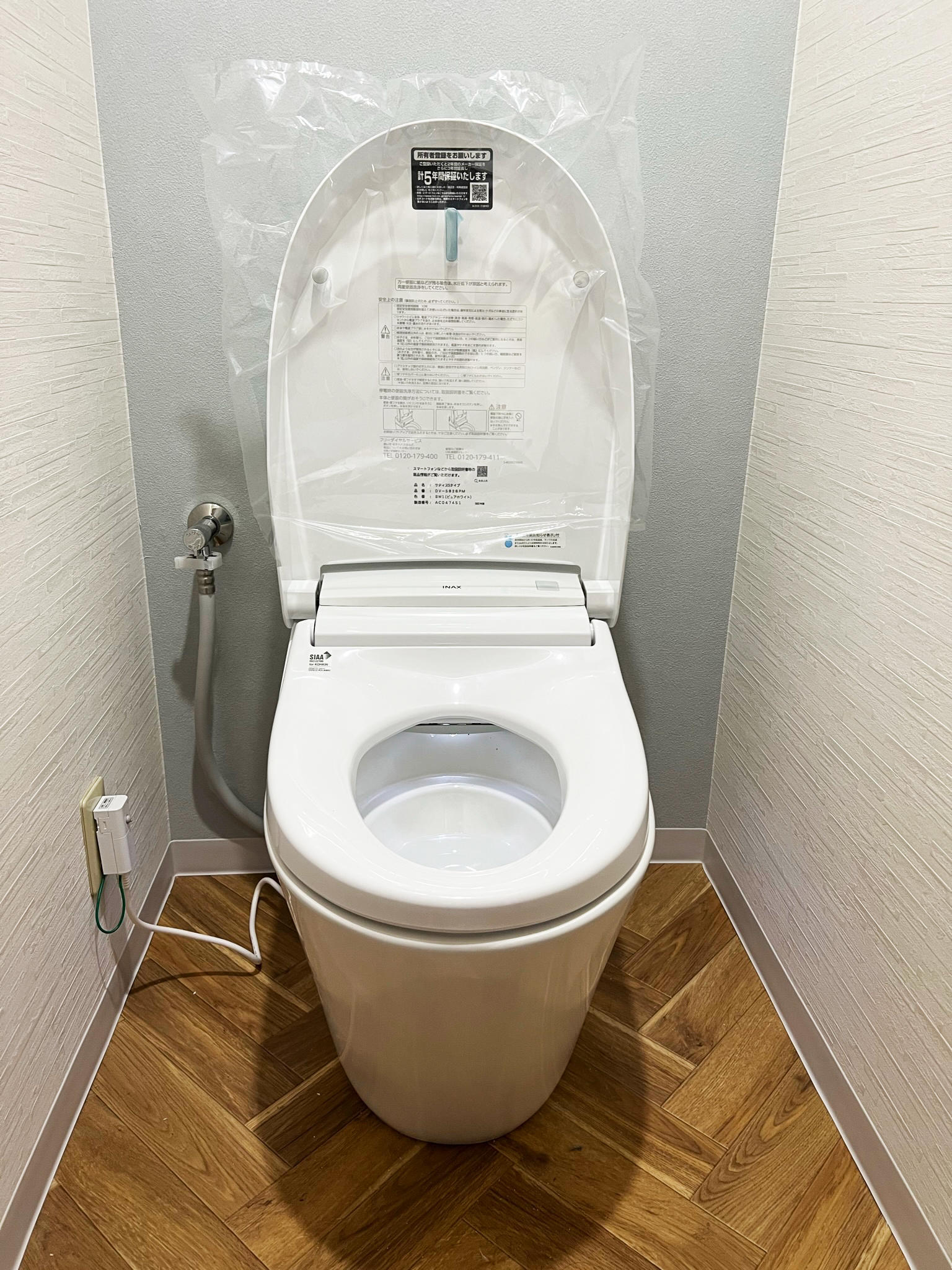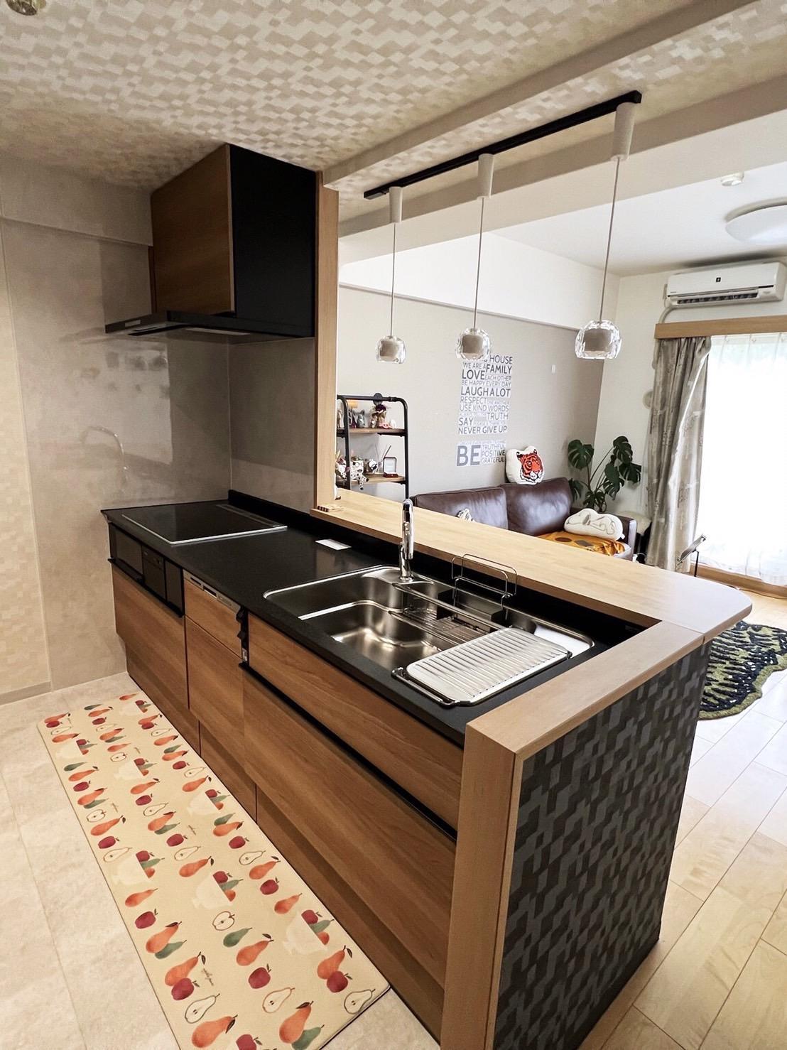価格を考えてノクトとし、天板に新色のブラックストーンを選択して頂きました。 扉カラーはチェリーで、落ち着いた色合いとなりました。 キッチン壁を大幅に解体、コンセントやインターホンを移設して腰壁残しとしました。 開放感のあるキッチンに大変身、奥様が大喜びでした。