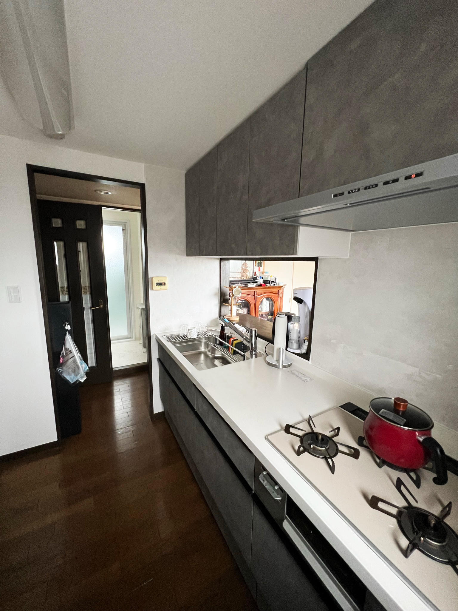 角部屋で、壁が直角ではないため、熟慮の末、2280㎜というぎりぎりの寸法で納めさせて頂きました。 梁があるため、レンジフードはSERを選択し、きれいに納めることが出来ました。