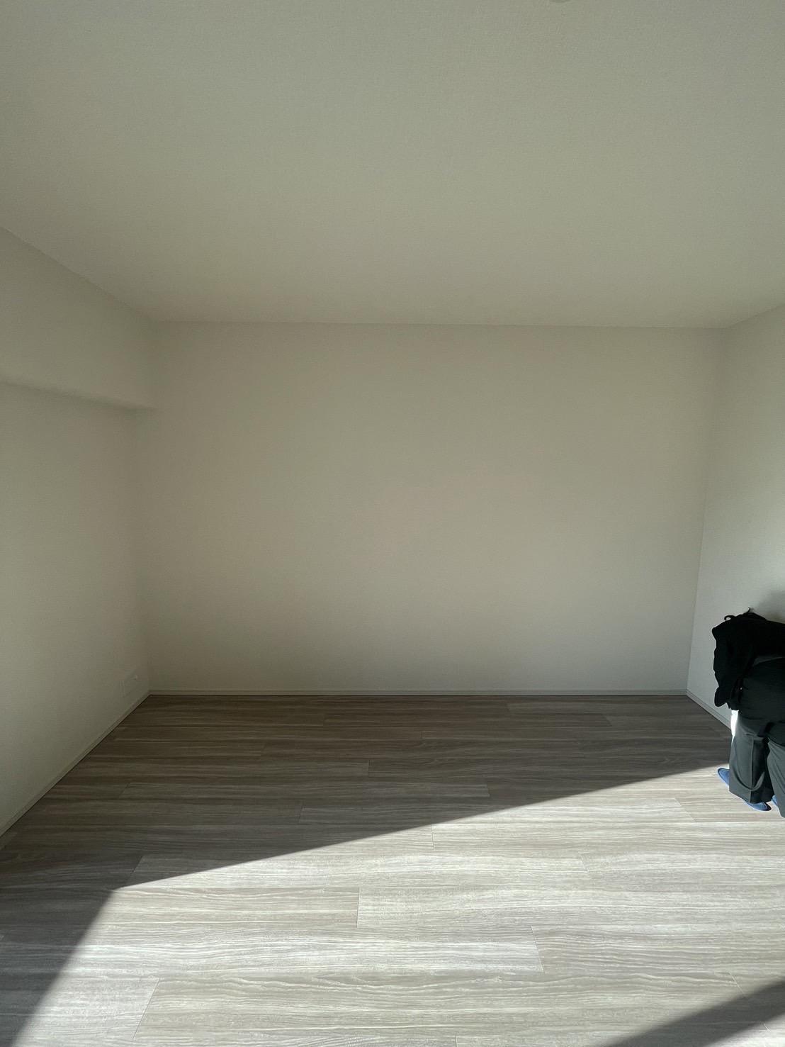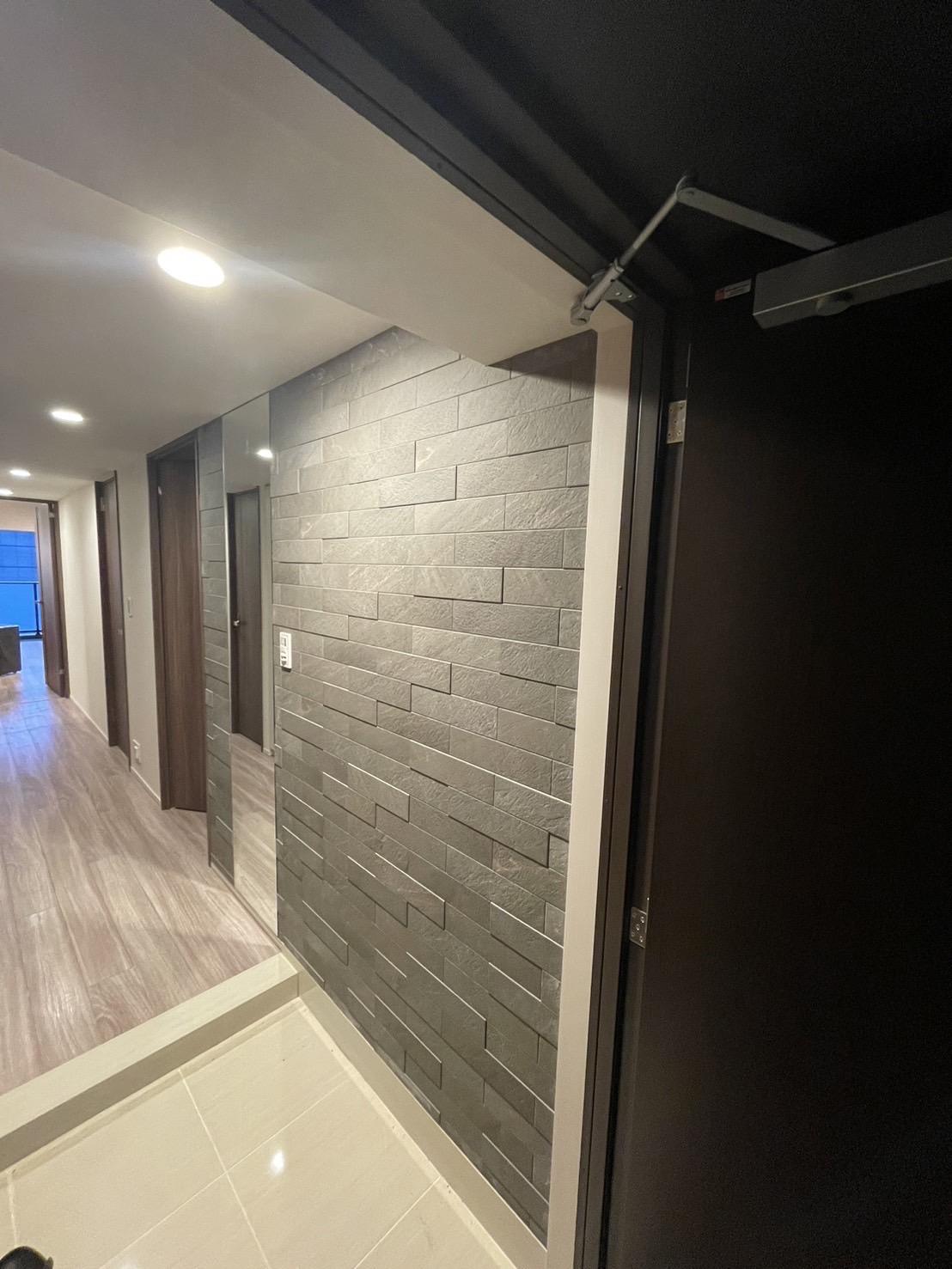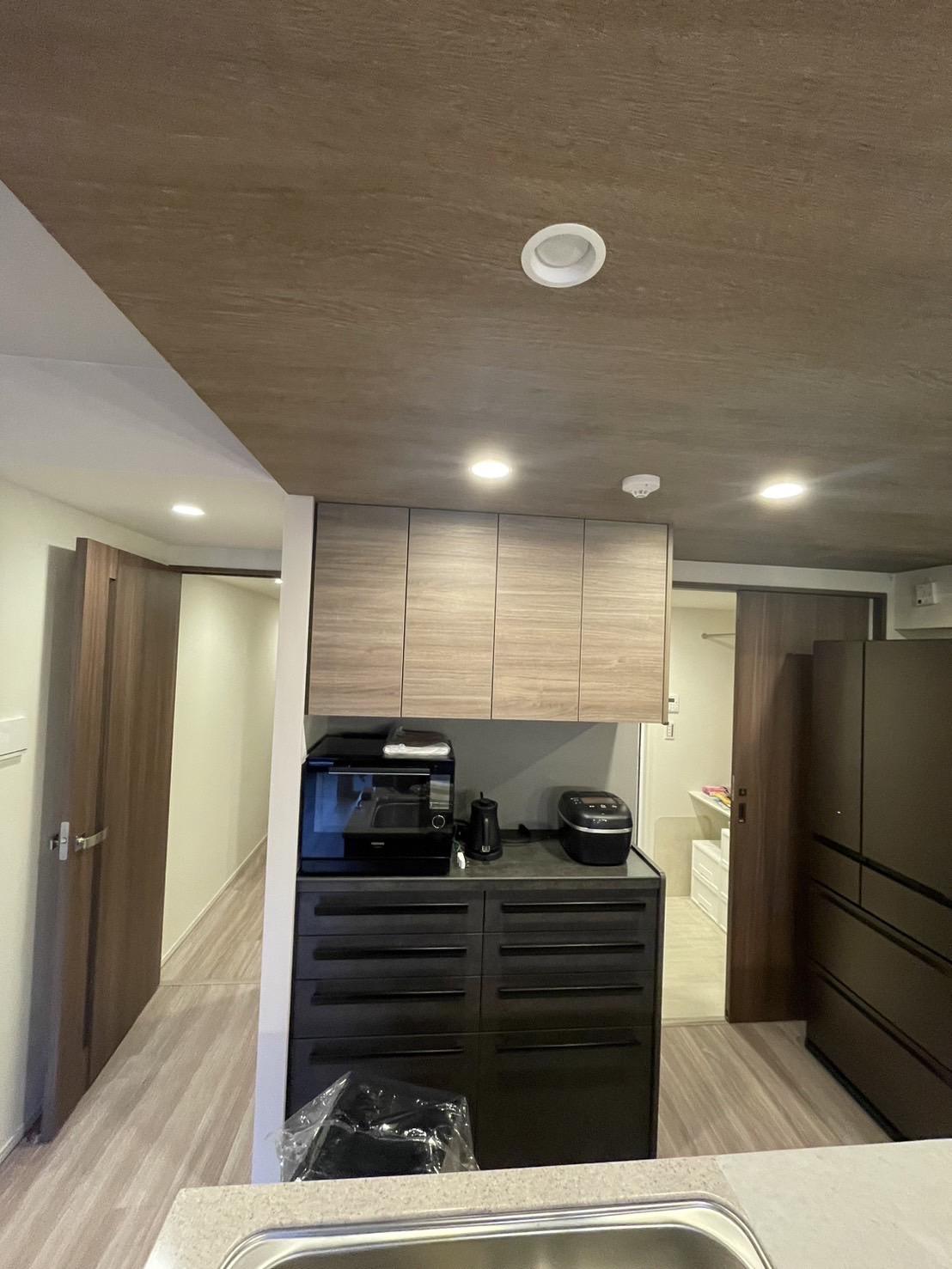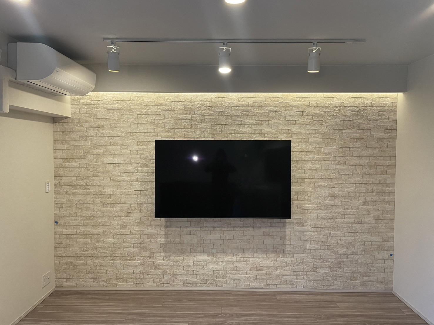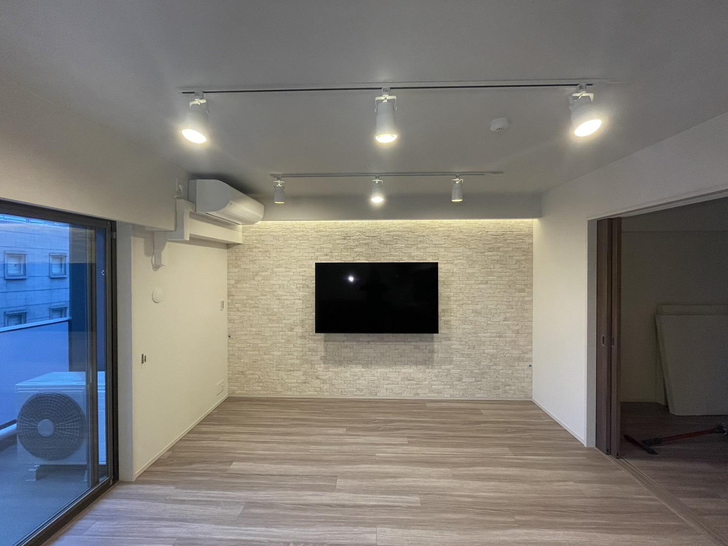 リビングにヴィストNXのエコカラット、壁掛けテレビ、下りの壁を作って照明仕込み、シーリング撤去しライティングレール設置。