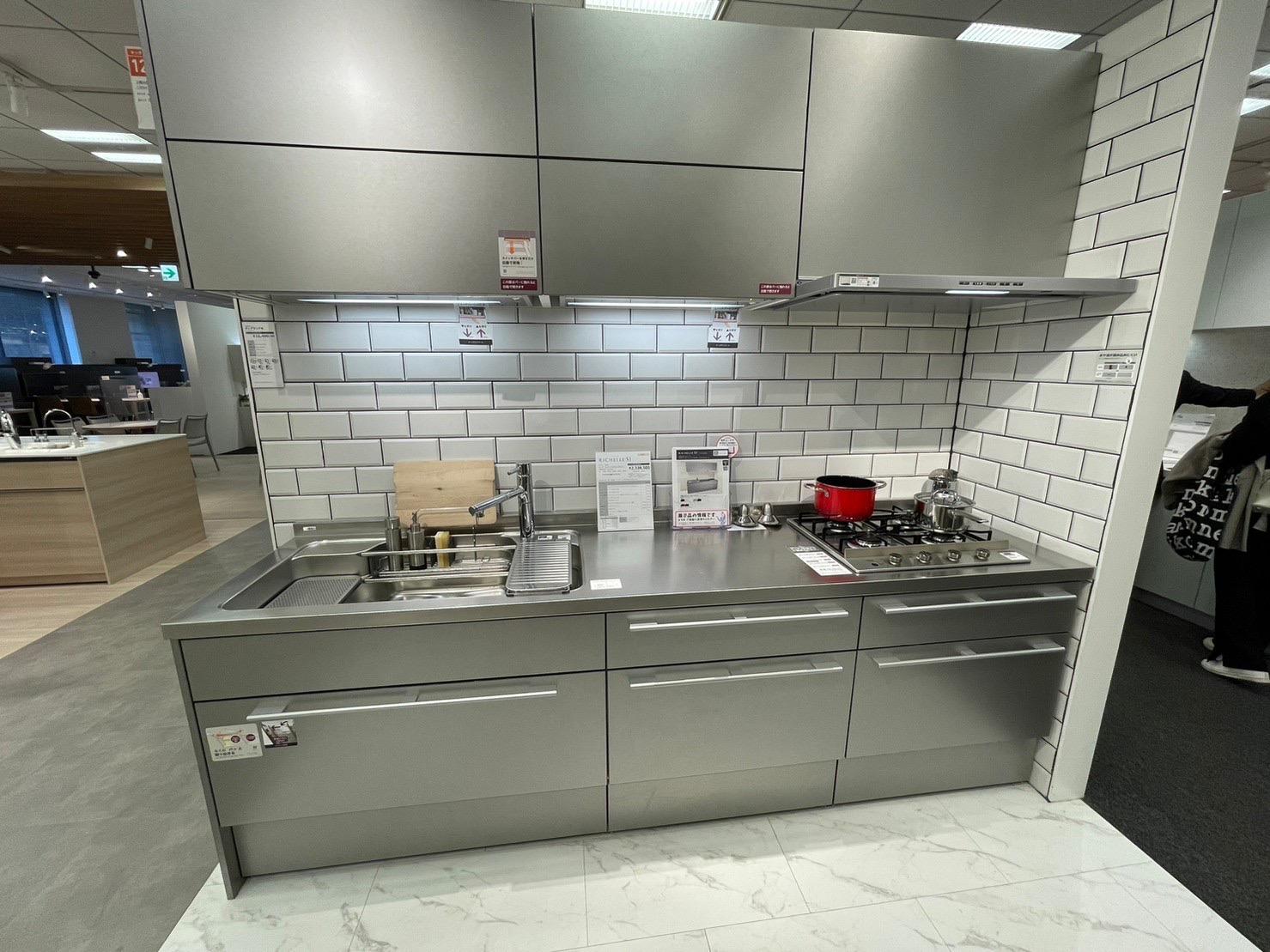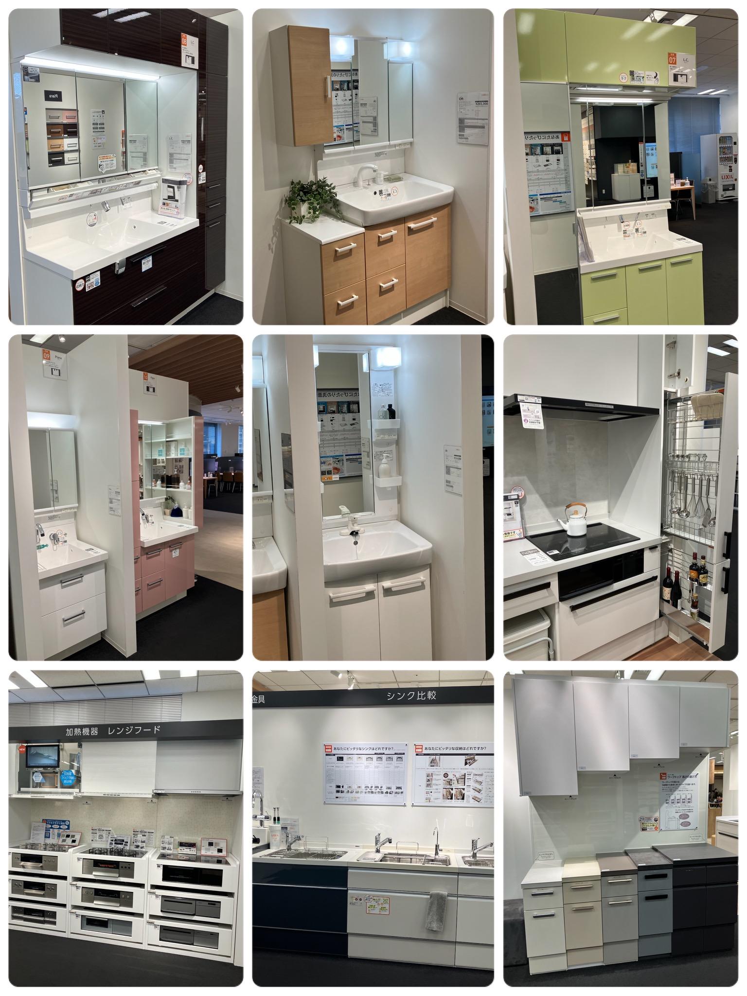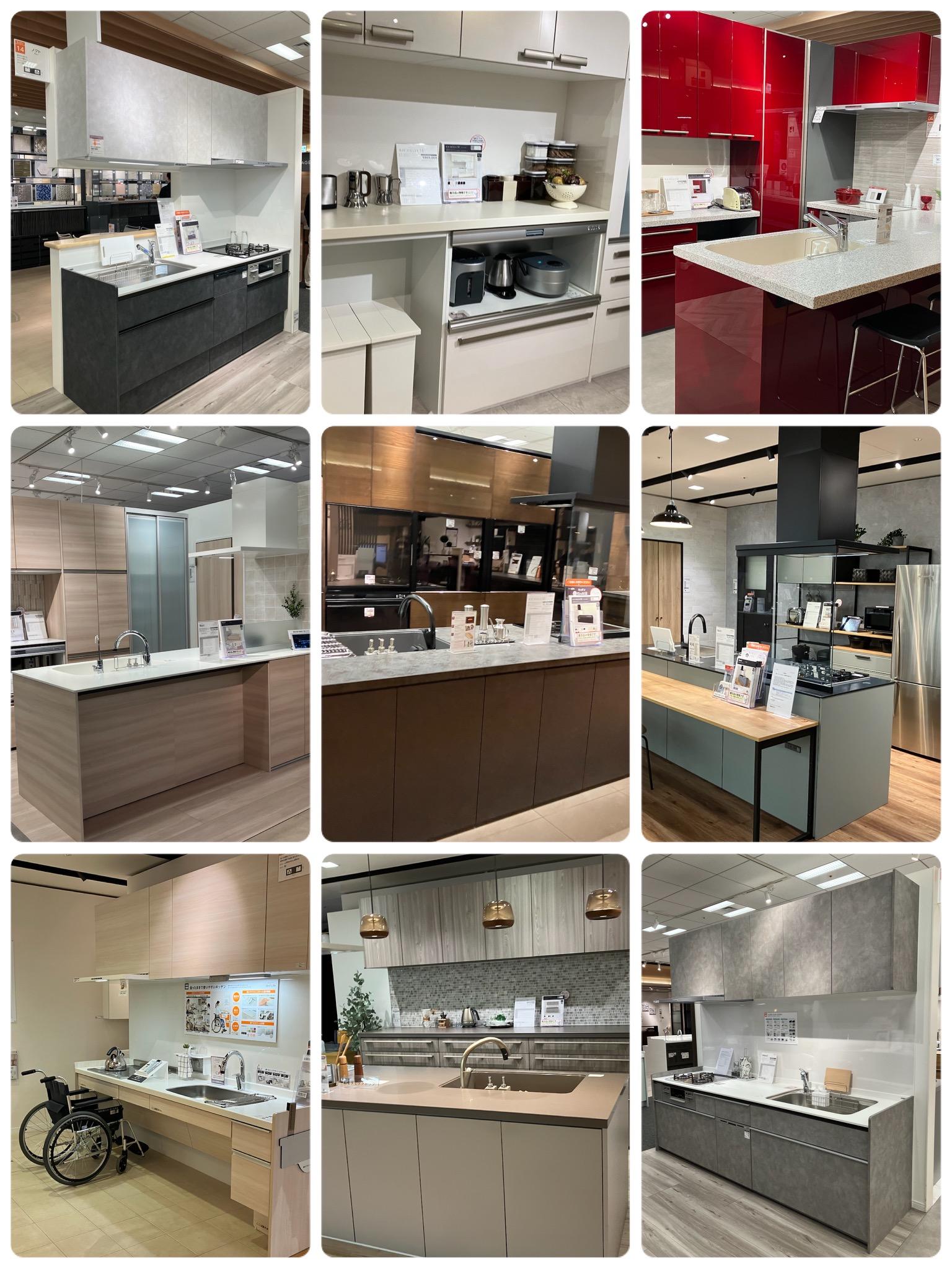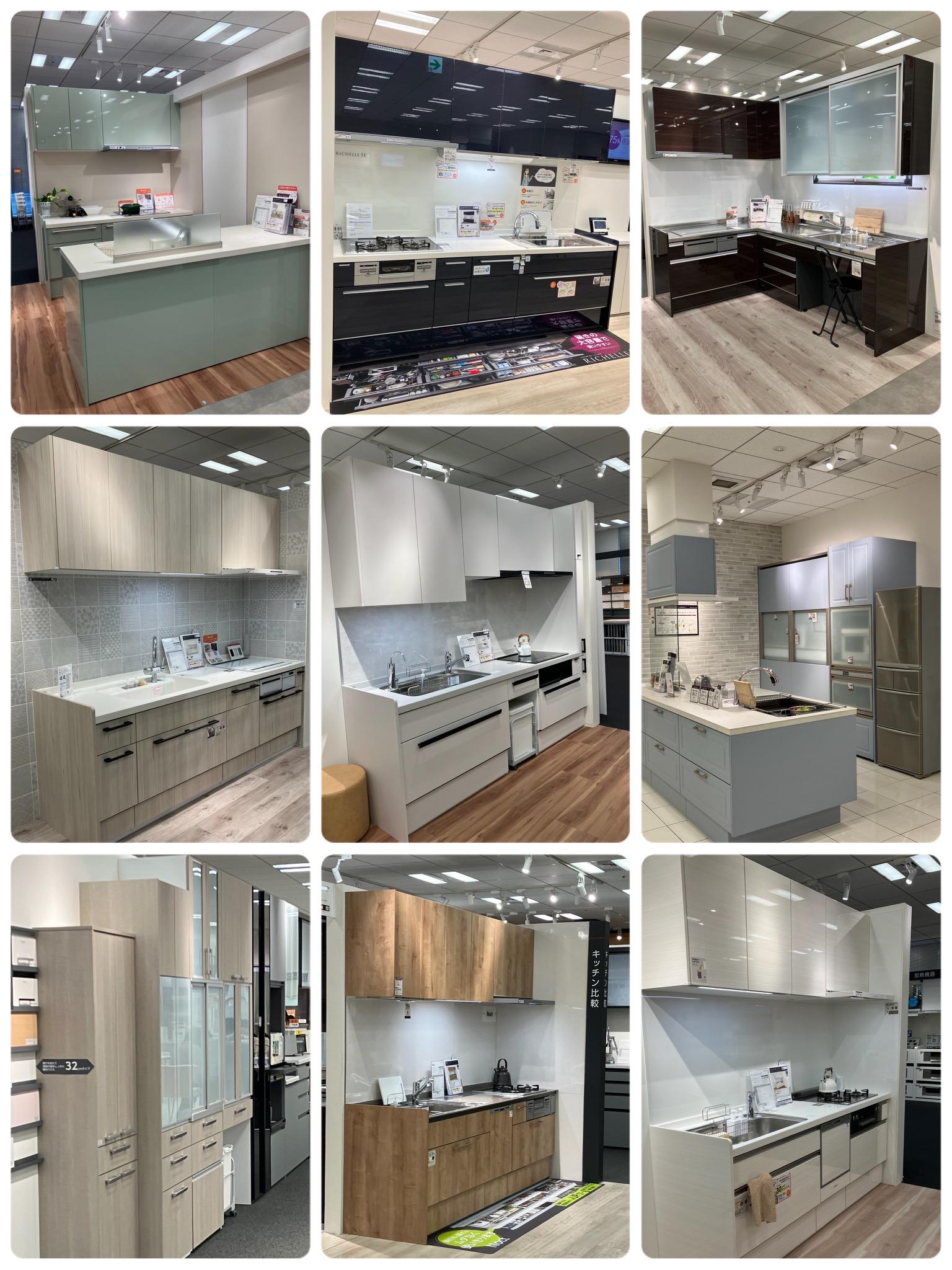 キッチンは種類もカラーも豊富でカップボードなども一緒に展示してあり、ワークトップの高さも確認できます。最近はキッチンの色と吊戸棚の色を変える方もいらっしゃるそうです★
