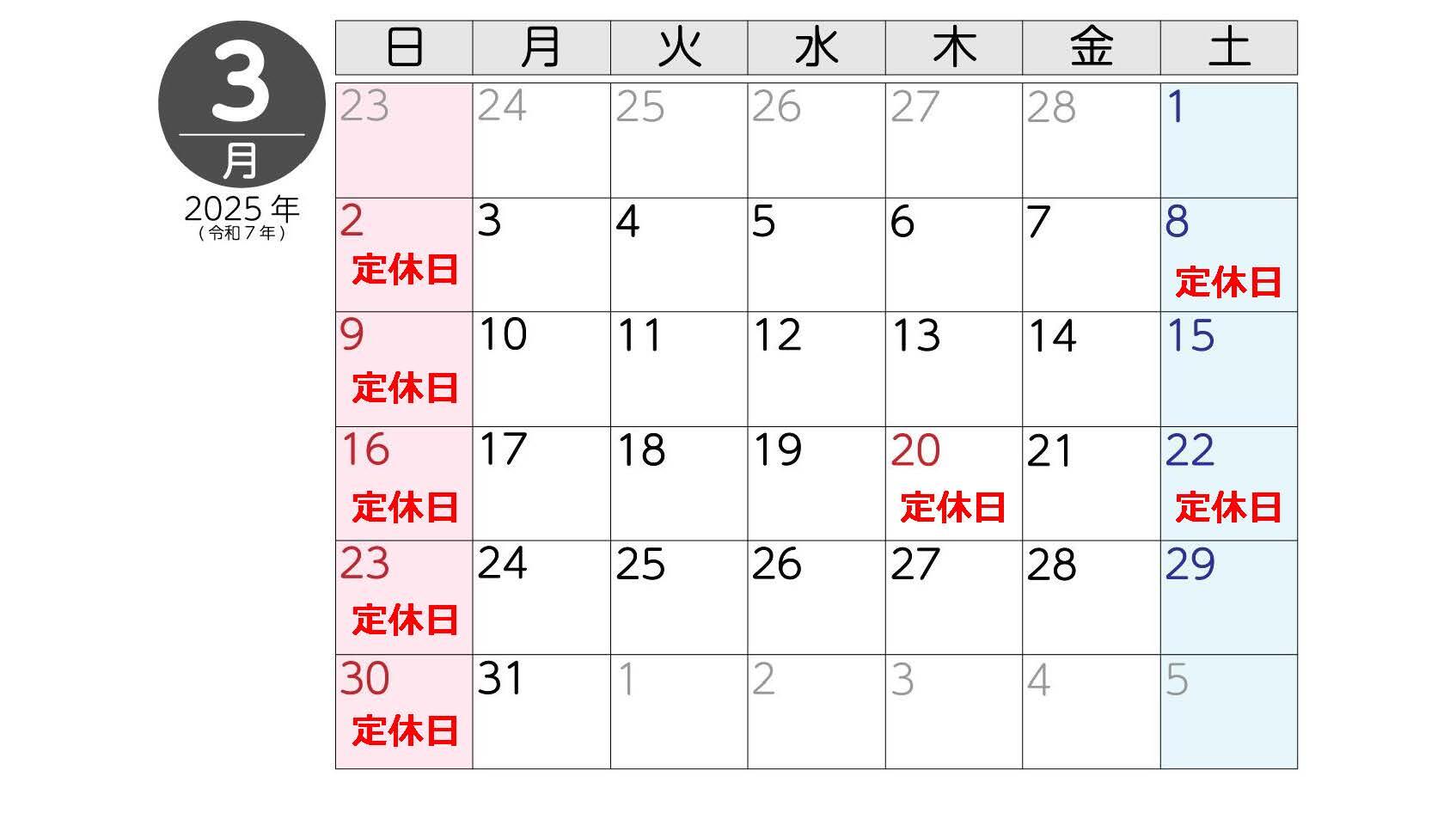 3月の定休日は、日曜・祝日・第二、第四土曜となっております。