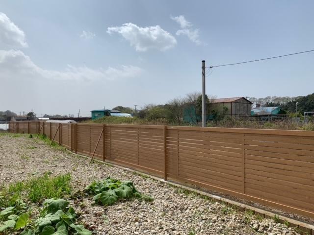 お施主様は、防犯の為に目隠しになるフェンスの取付のご希望をされておりました。近隣には田畑などもあり、風も非常に強い環境でした。そのため、背の高すぎない目隠しフェンスで強度を上げるために数か所控え柱も設置させていただきました。