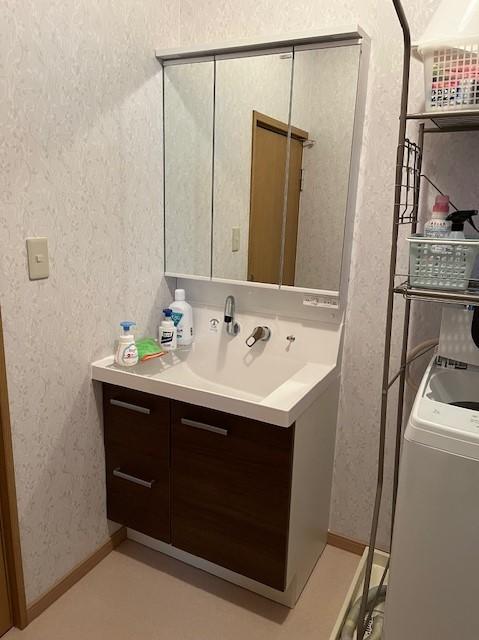 〇1面鏡の洗面化粧台をLIXILの3面鏡洗面化粧台へ交換工事を行わせていただきました。それにより、洗面用具を鏡の中に収めることができます。 〇収納板は流行りの木目調カラーをご採用いただき、洗面所の内装も変更工事をさせていただきました。床のクッションフロアや巾木は明るめのお色をお選びいただいたことにより、洗面所全体がより明るく感じられるようになりました。