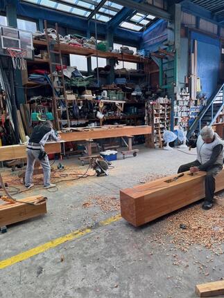 工場では、二人のベテラン大工が木目やクセを見極めながら、