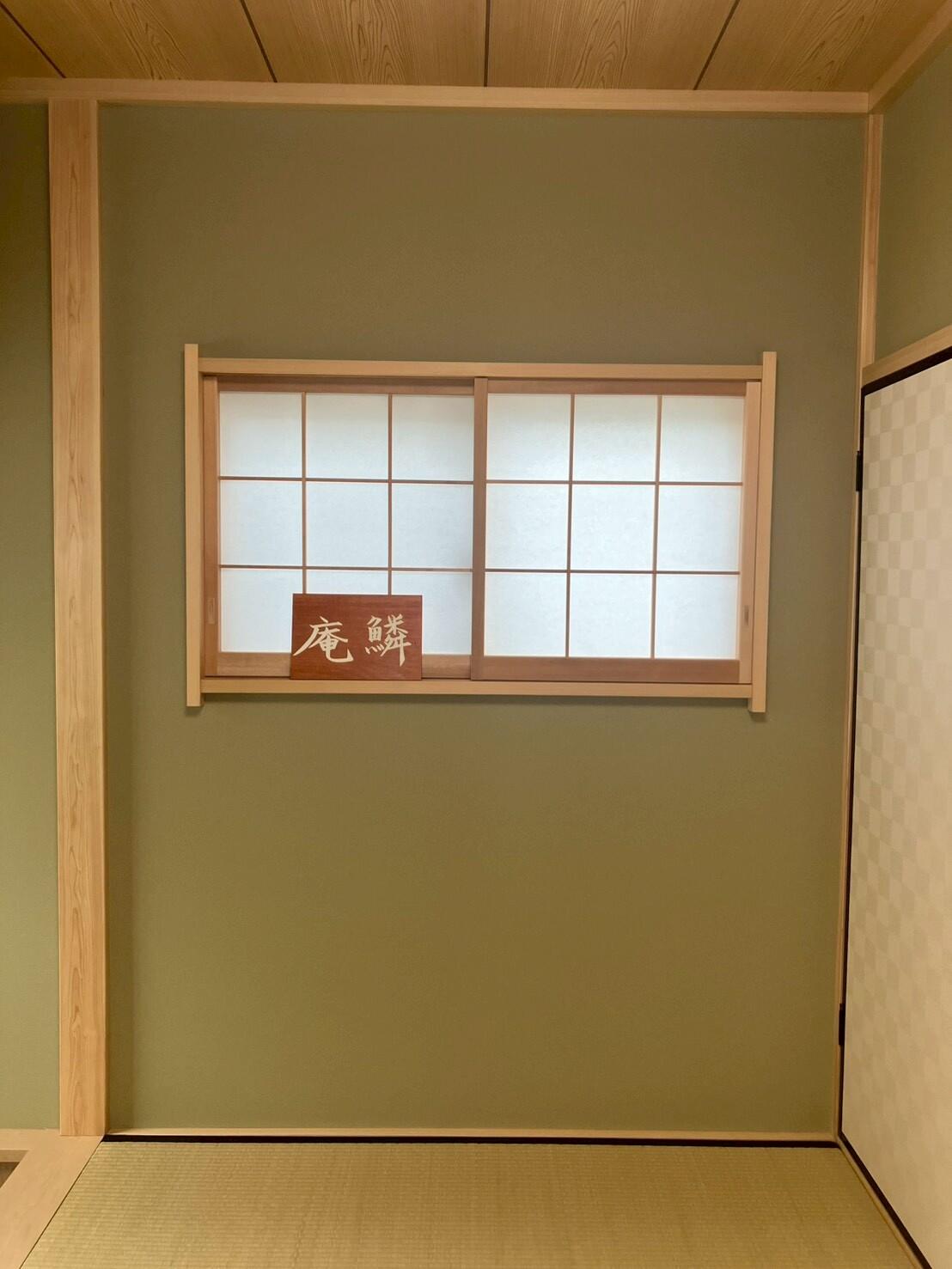 完成したお茶室の窓辺に置かれた「鱗庵」の銘板は、