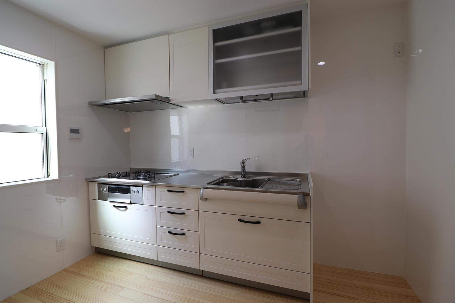 壁とキッチンを白で統一。窓から入ってくる優しい光で明るいキッチンです。