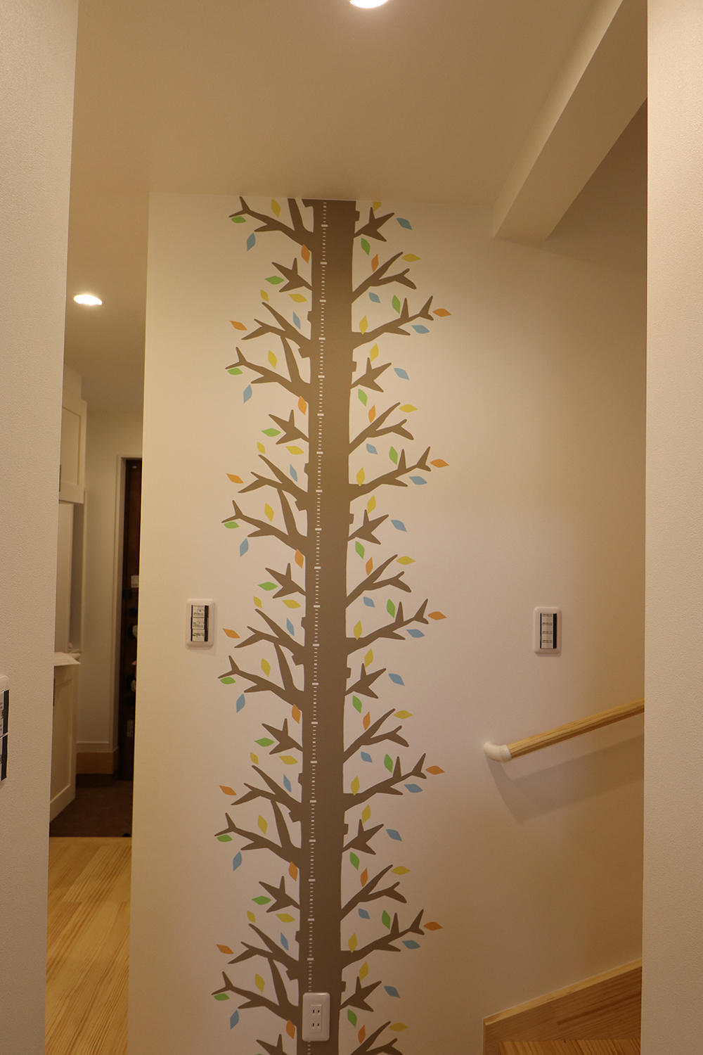 階段下の壁紙は身長が測れるようになっています。目に見える子どもたちの成長が嬉しいですね!