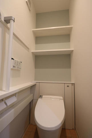 白とブルーのさわやかなトイレ。収納もたっぷりです。