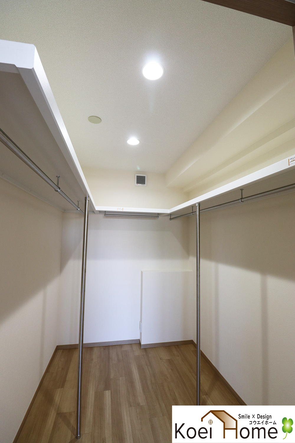 部屋の一つをウォークインクローゼットにし少々服が多くても困らない程のスペースが、魅力的ですね。上にも物が置けるようになっているので季節ものや趣味等物置きにも。