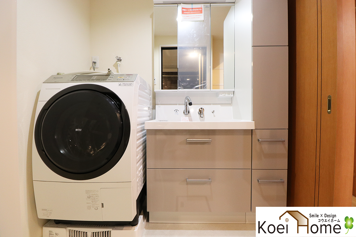 脱衣場、洗面場も広々としており洗濯や朝の用意に混雑も避けれそうですね。鏡も大きので見やすいです。収納量も大きく色々とストックしてしまいそうですよね。