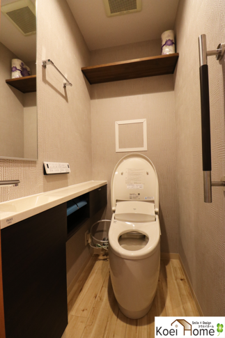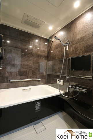 お風呂はリノビオVを使用しています。黒や茶を使いシックでオシャレなお風呂になっています。毎日の事なので落ち着きリラックスできる空間は大事ですね。