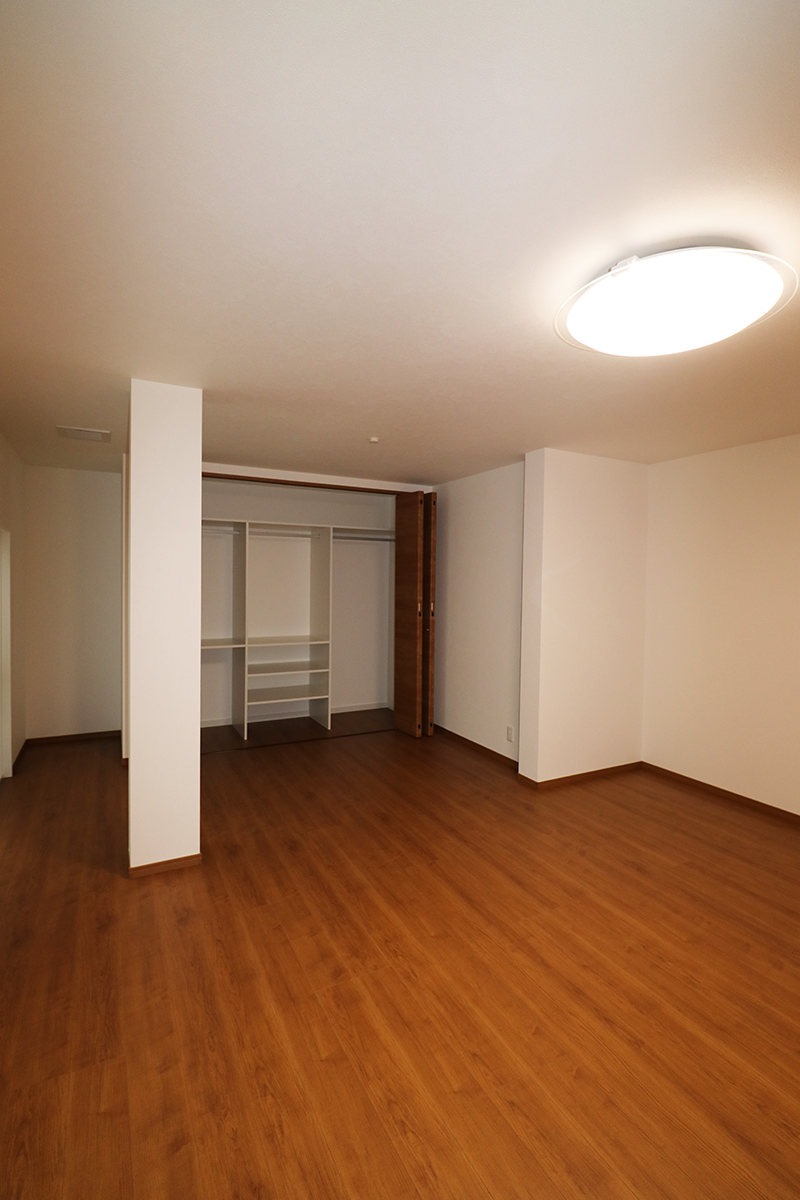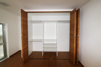 元々じゅうたん張りだったリビングを全面フローリングに張り替えています。じゅうたん張りがフローリングに替わり壁紙も白を基調としているので、とてもスッキリとした落ち着く空間に仕上っています。クローゼットの大容量収納も奥側にあり使い勝手も良さそうですよね。