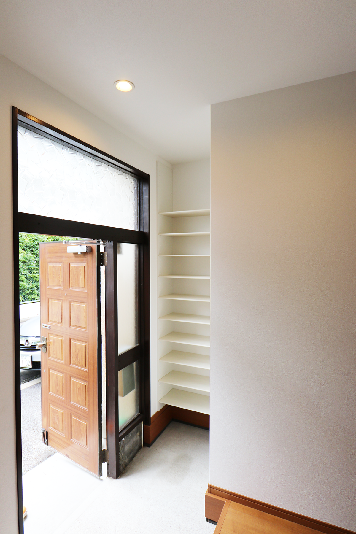 玄関全体的に色合いが明るくなり、大容量のシューズクロークが備えられ更にスッキリした雰囲気になりました。靴だけではなくある程度の物置きにも活用できそうですね。