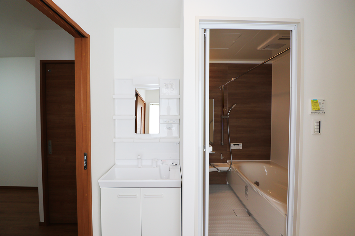 こちらは店舗だった空間をバスルーム、洗面場、脱衣室として新たな空間として作り替えています。場所も違う新しい空間心機一転新しいお家さながらな気分ですね。生活まわりの空間を一階に持って来る事で使い勝手も良くなりそうですね。