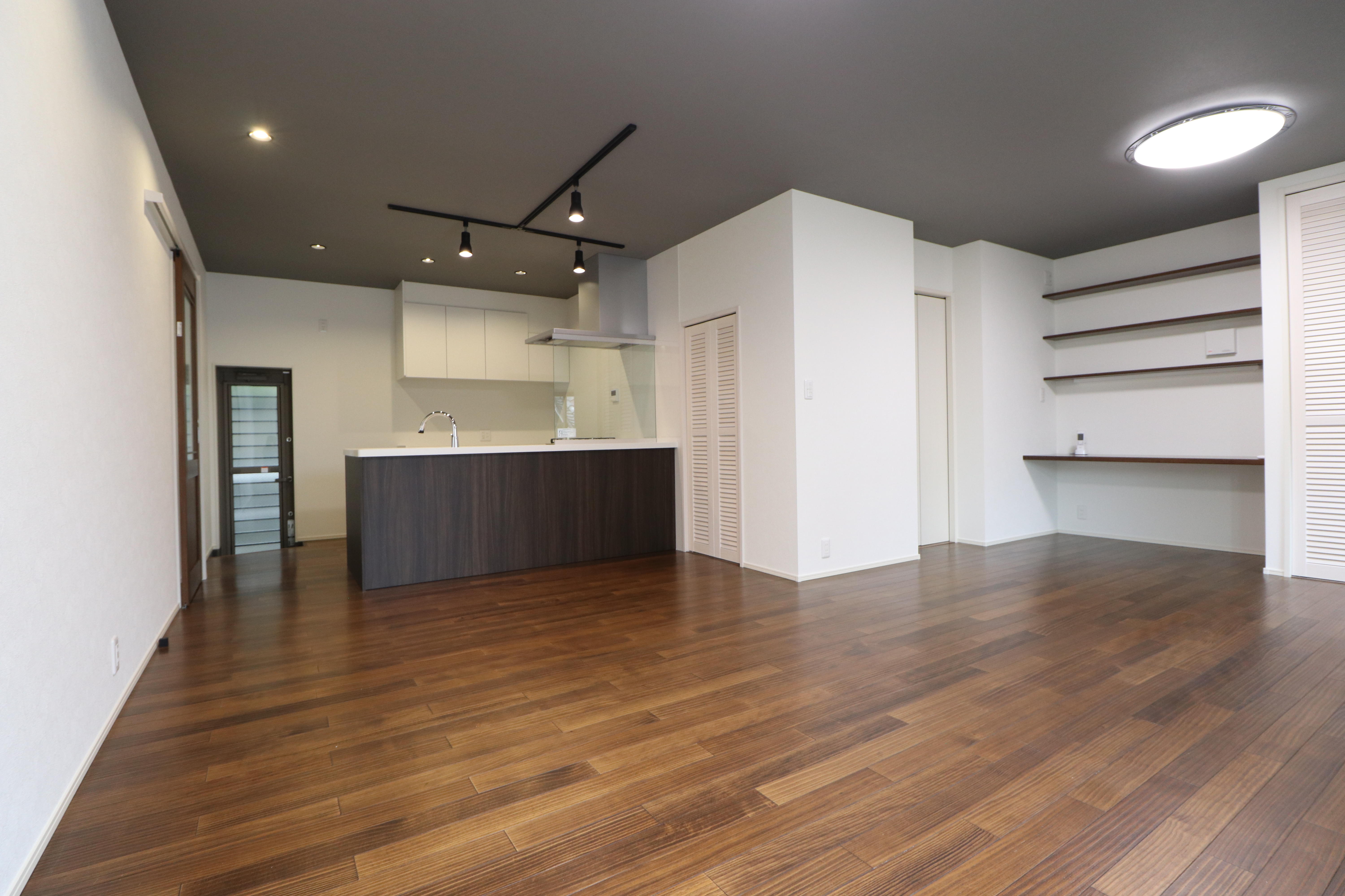 広々とした開放的なLDK。天井のグレーのアクセントクロスがスタイリッシュな空間に。フローリングは無垢フローリング。うずくり加工の無垢フローリングなので、凹凸の肌触りがとても気持ちがいいです。リビングの奥にはワークスペースを設置。お子様のお勉強や在宅ワークに、あったら便利!なワークスペースです。