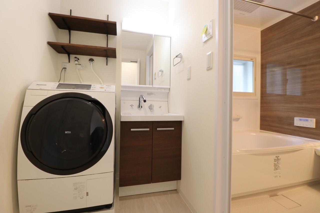 洗面化粧台はLIXILのピアラです。洗面化粧台の扉色と洗濯機上の棚の色がマッチ!浴室のパネルの木目調とも統一感があり、スッキリと清潔感のある水まわり空間になりました。