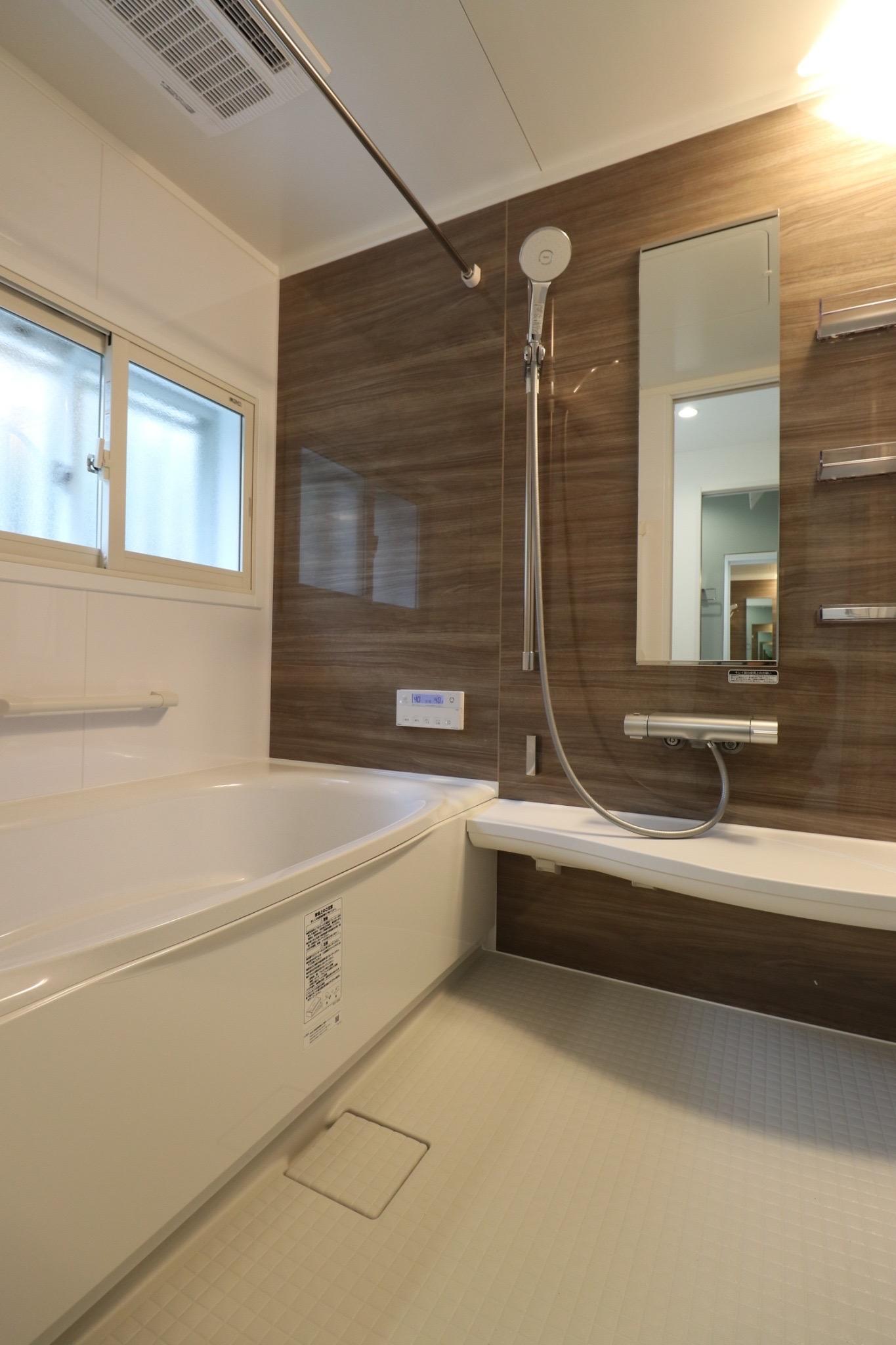 浴室はLIXILのリノビオVです。タイルのお風呂からユニットバスに。浴槽にも入りやすくなり、安心安全なバスタイムをお楽しみいただけます。窓には内窓インプラスを設置し、断熱性能も高まり、快適な浴室になりました。