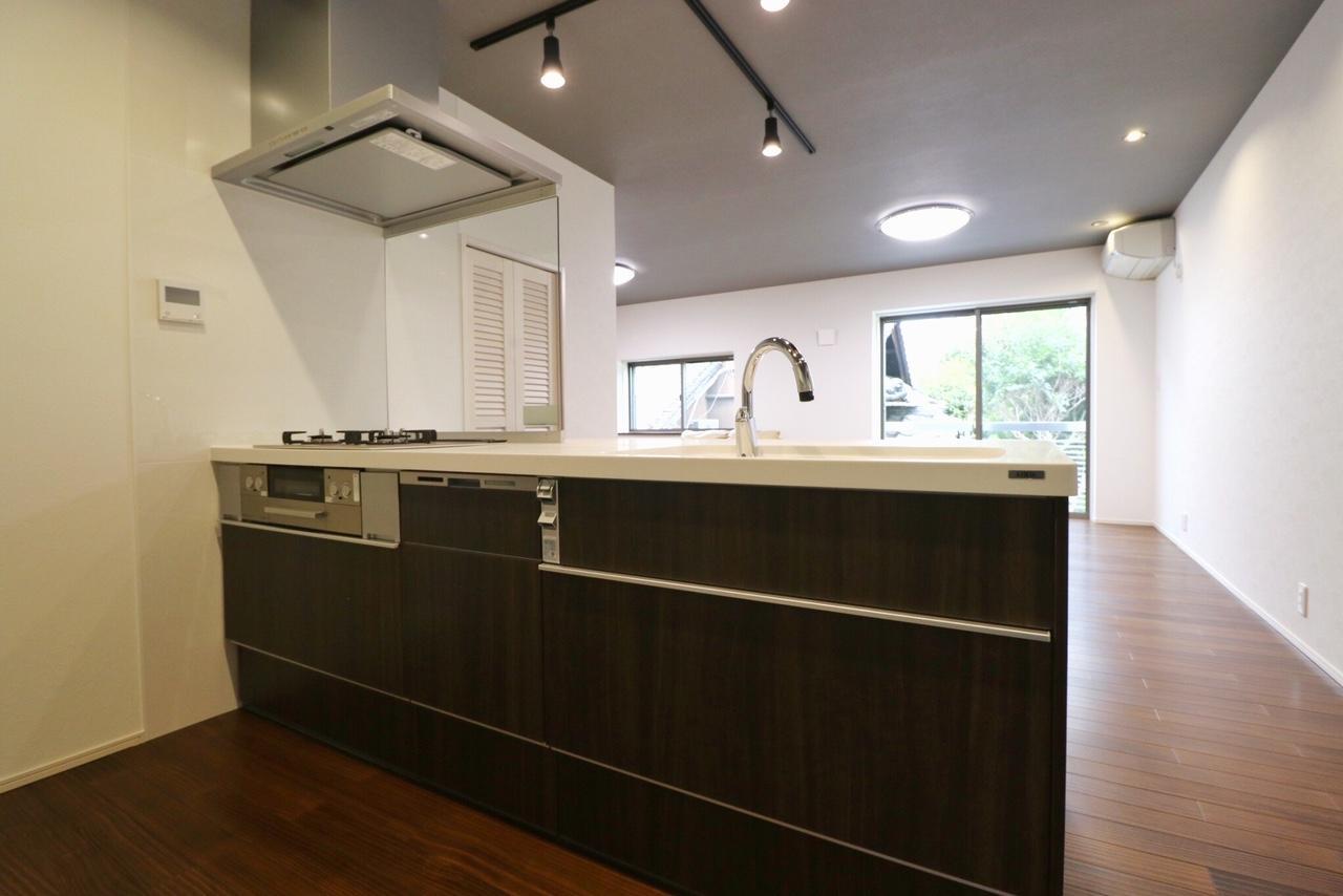 キッチンと居間、独立した空間を開放的な一つの空間に。対面キッチンで家族同士の会話も弾みます♪リビングの大きな窓がとても素敵✨キッチンはLIXILのシエラSです。水栓は手をかざすだけで水を出したり止めたりできる自動水栓を選ばれました。使い勝手の良いキッチンです。