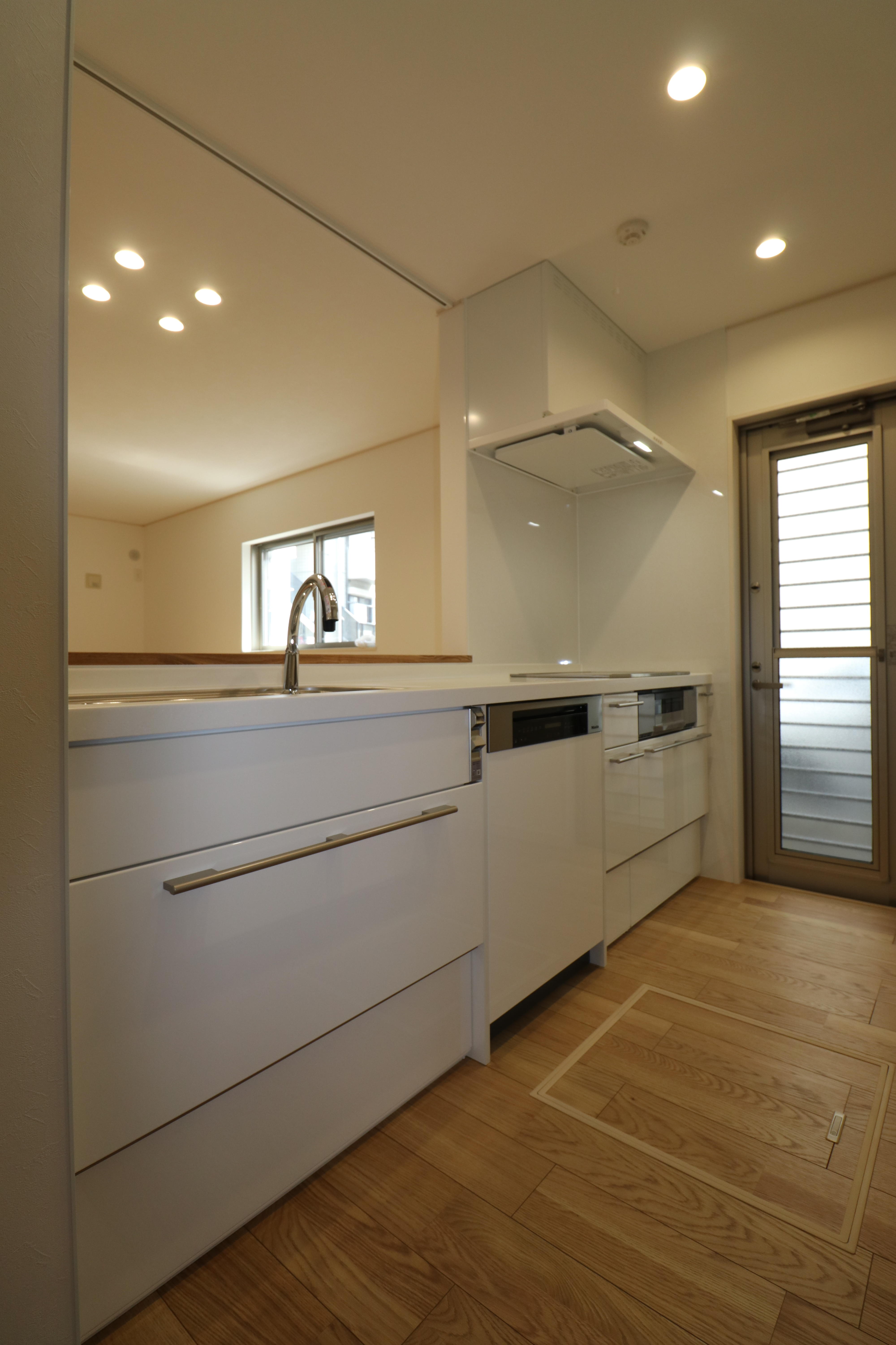 キッチンの吊戸棚をなくしたことで、ダイニングとキッチンの隔たりが少なくなり、繋がりをより感じられるような空間に。