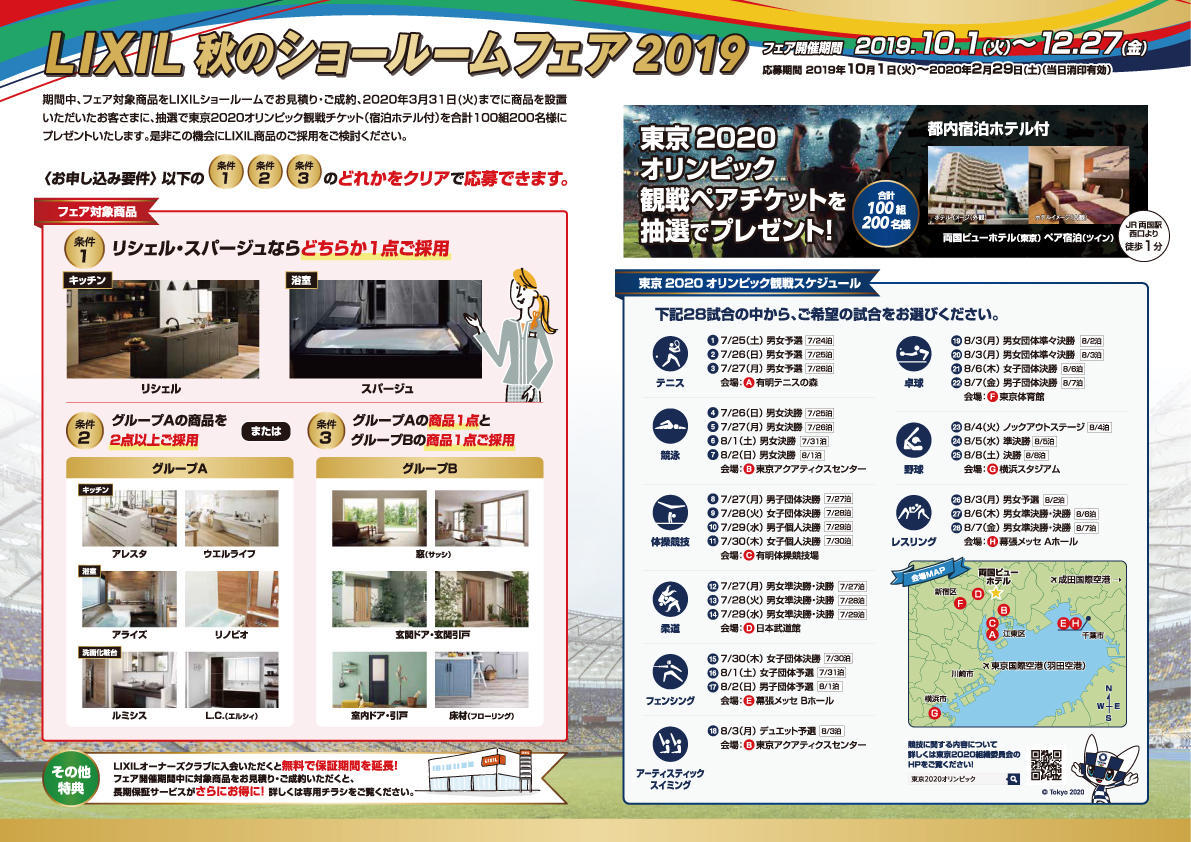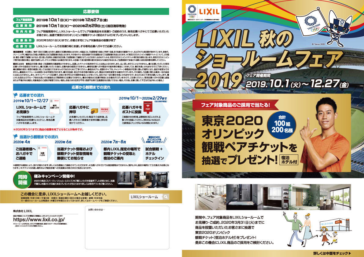 2019年10月1日(火)~12月27日(金)の期間、秋のショールームフェアでお見積り・ご成約、2020年3月31日(火)までに商品を設置いただくと