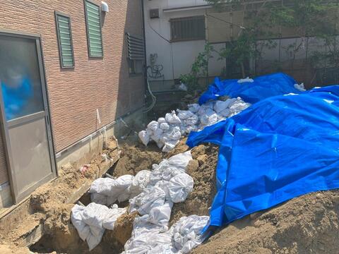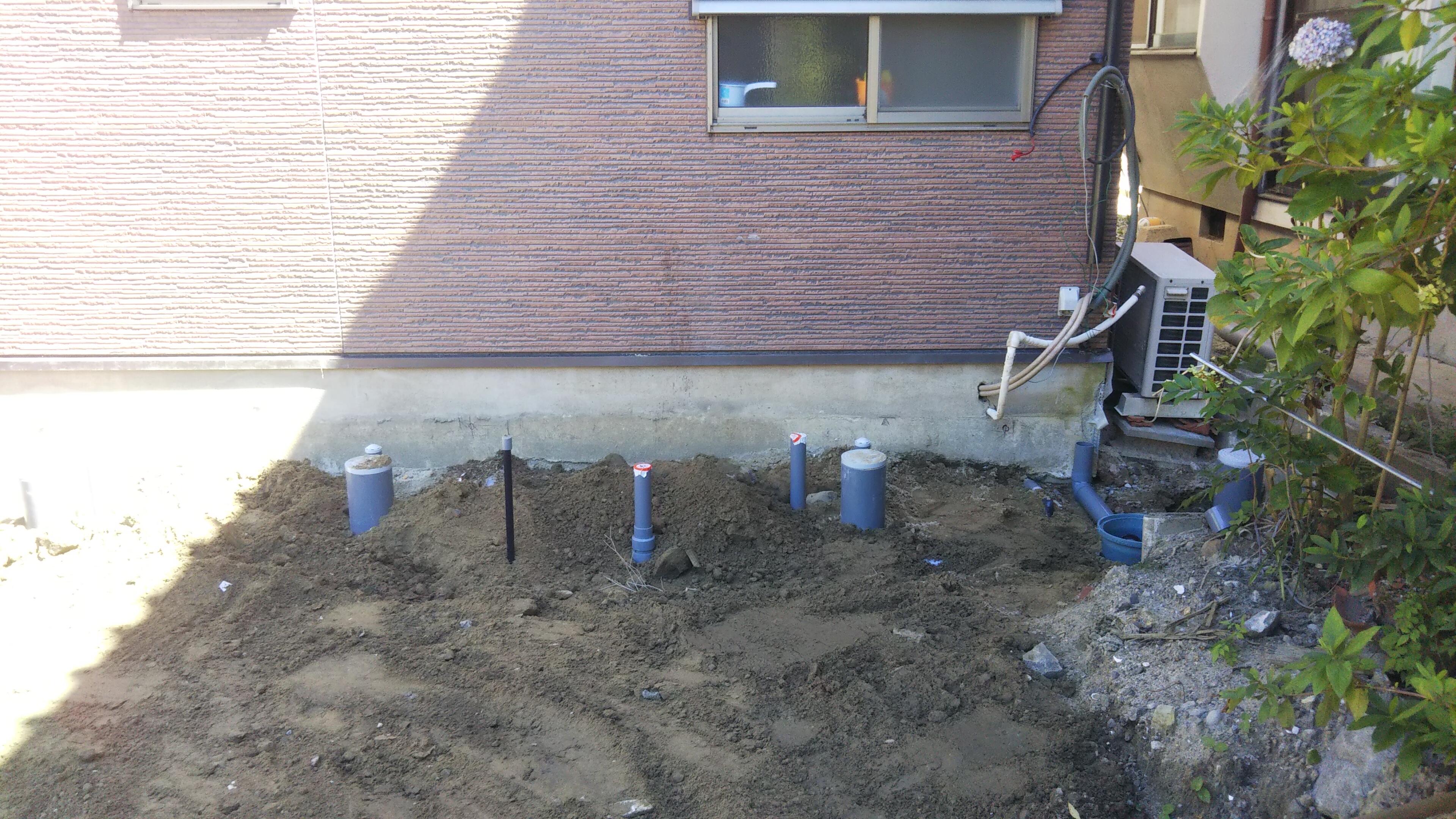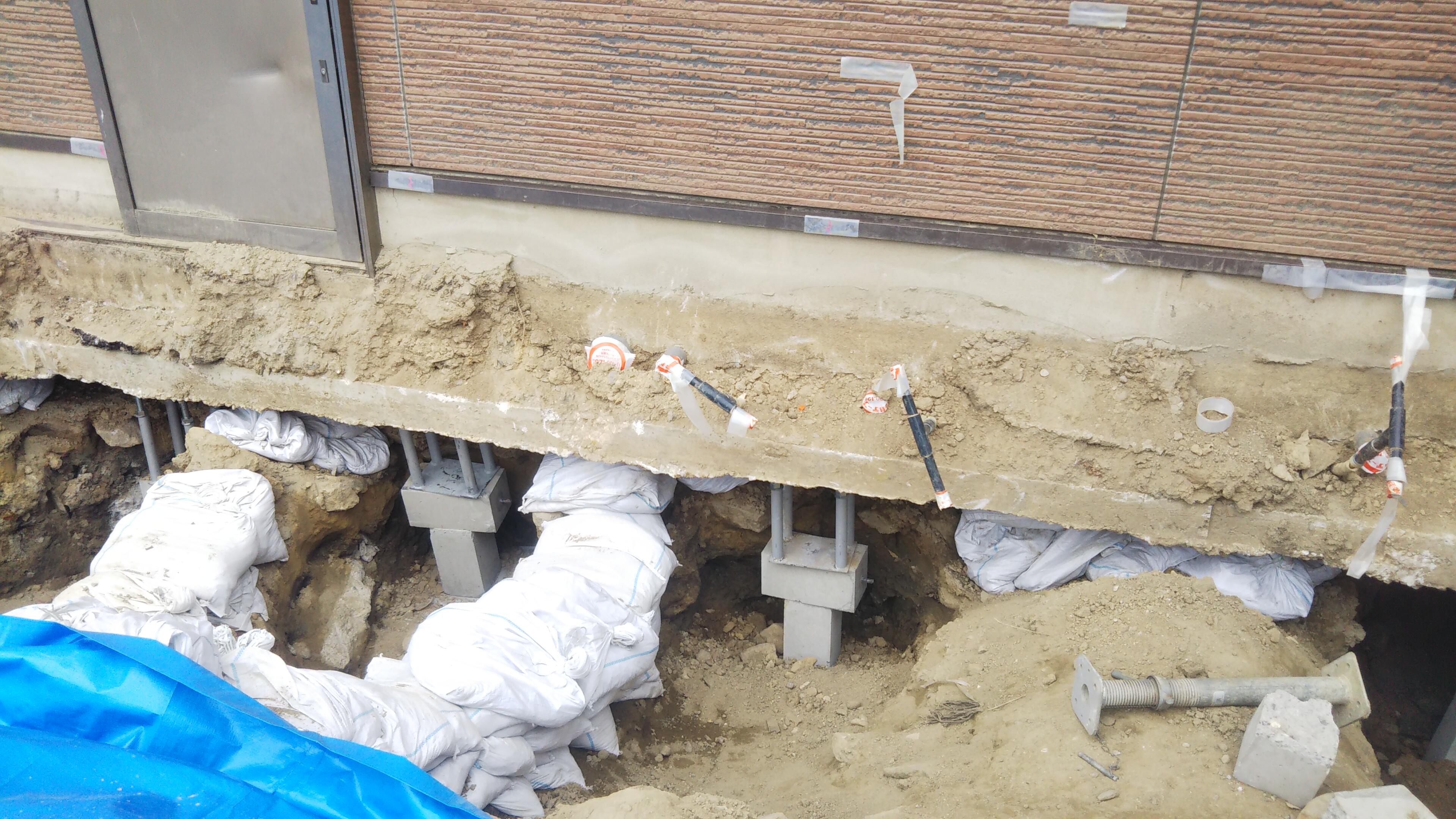 今回施工させていただいたのは、アンダーピニング工法(ジャッキにて支持杭を地中に打ち込み、建物を持ち上げる)です。 支持杭を地中の支持地盤(安定した地盤)まで埋め込むため、上層の軟弱な地盤の影響を受けず、工事後の安定性が高いのが特徴です。 住みながらの工事も可能でしたが、給排水設備も地震の為使用が出来なくなっていたので、仮住まいをしていただき施工しました。