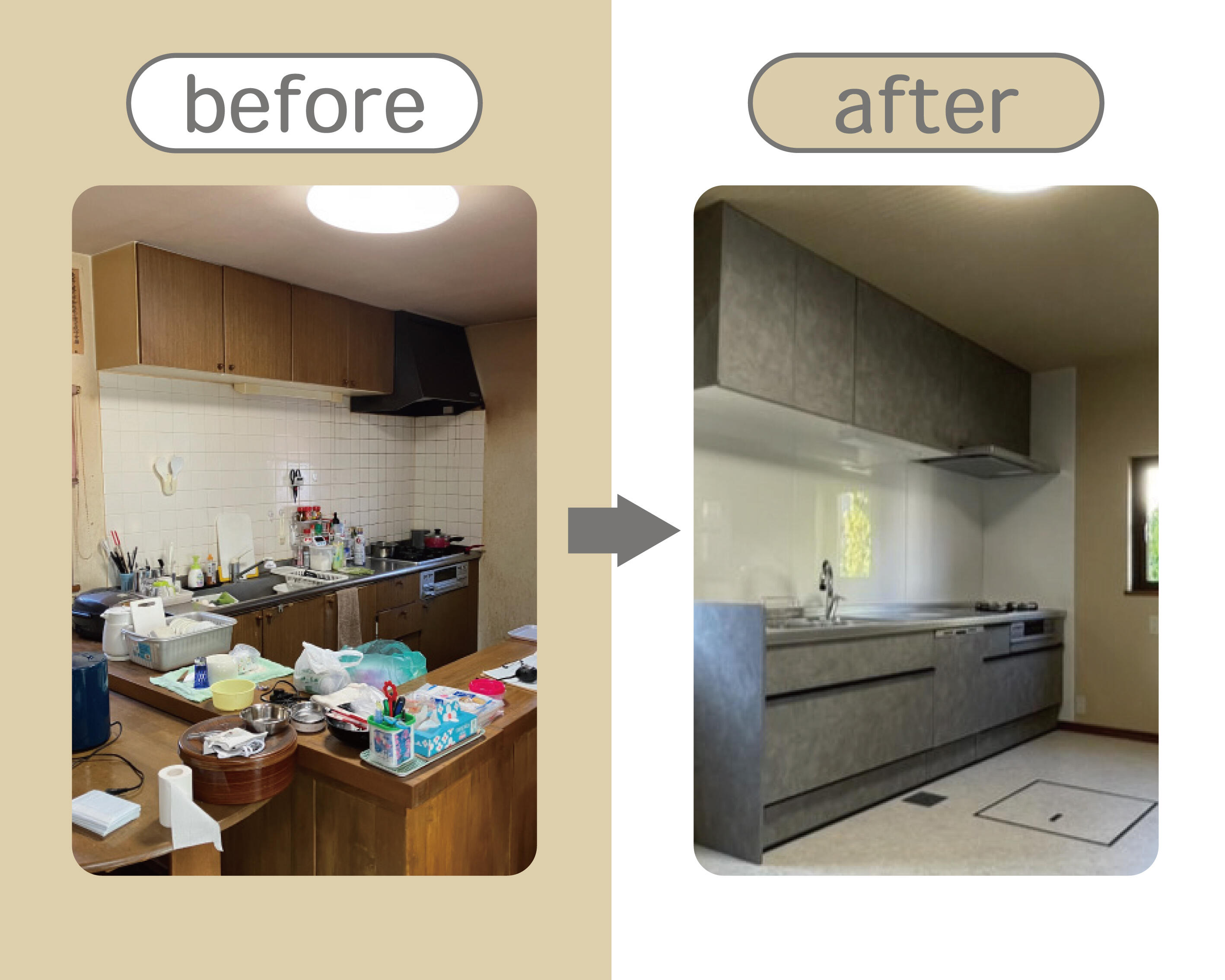 ご用命いただきありがとうございます! LIXILリフォームショップサイトーホーム弘前店 店長の鈴木です。 今回は、キッチンを取替えに伴い、もともとついていたカウンターを撤去して、広々とした空間になりました。 キッチンと収納棚のデザインをグレーの石目調に揃えることによって、統一感がある落ち着いた雰囲気になりました。