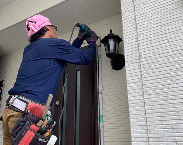 玄関ドアを入れ替えたので、外壁を切りました、切った廻りは窯業系のサイディングでカバーしました。アメリカンな建物によく見られます。
