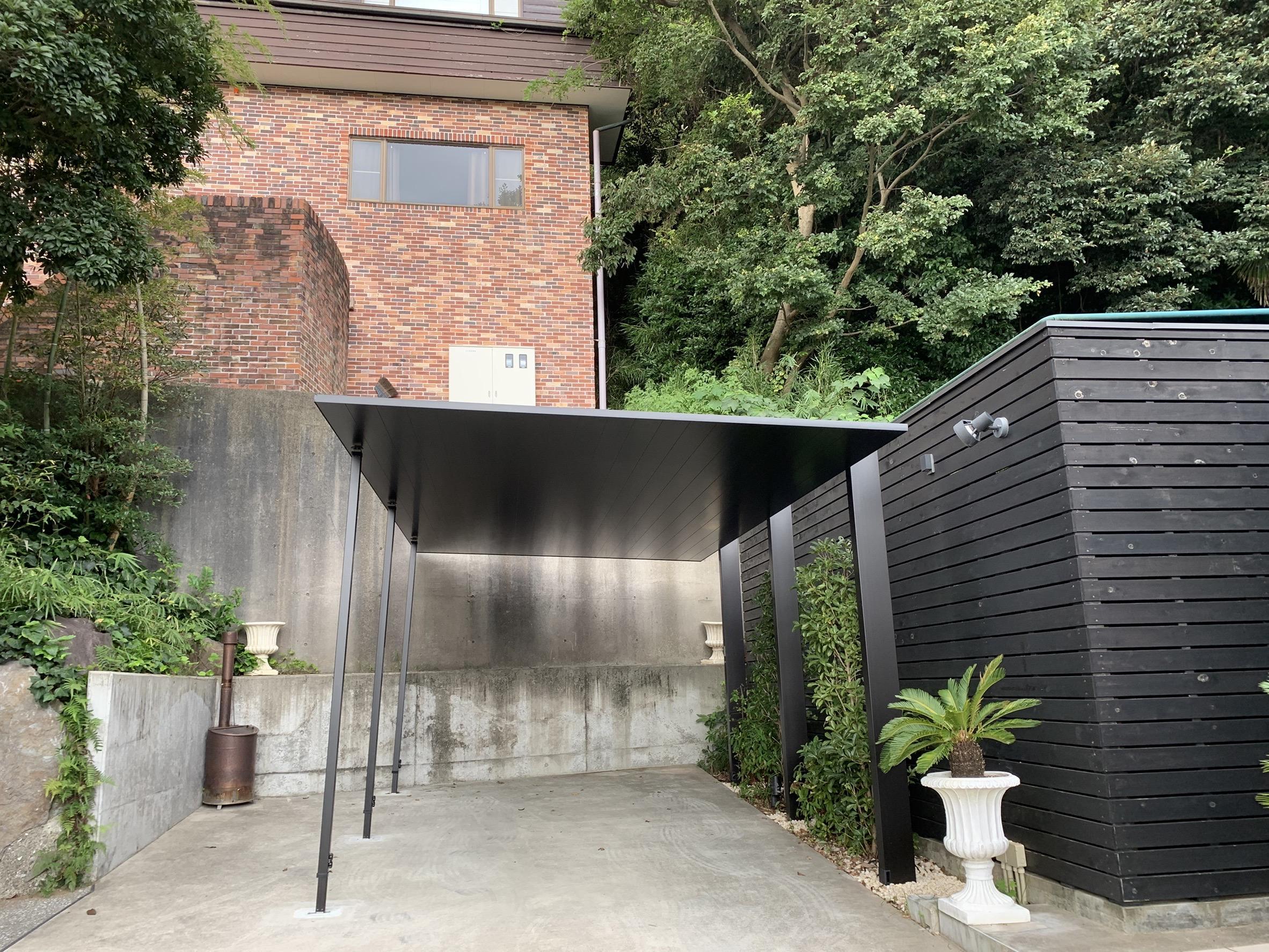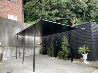LIXIL『カポートSC』1台用をご提案させていただきました。お庭の木製フェンスにマッチした、シンプルで主張しすぎないスタイリッシュなブラックでお洒落な仕上がりとなりました。