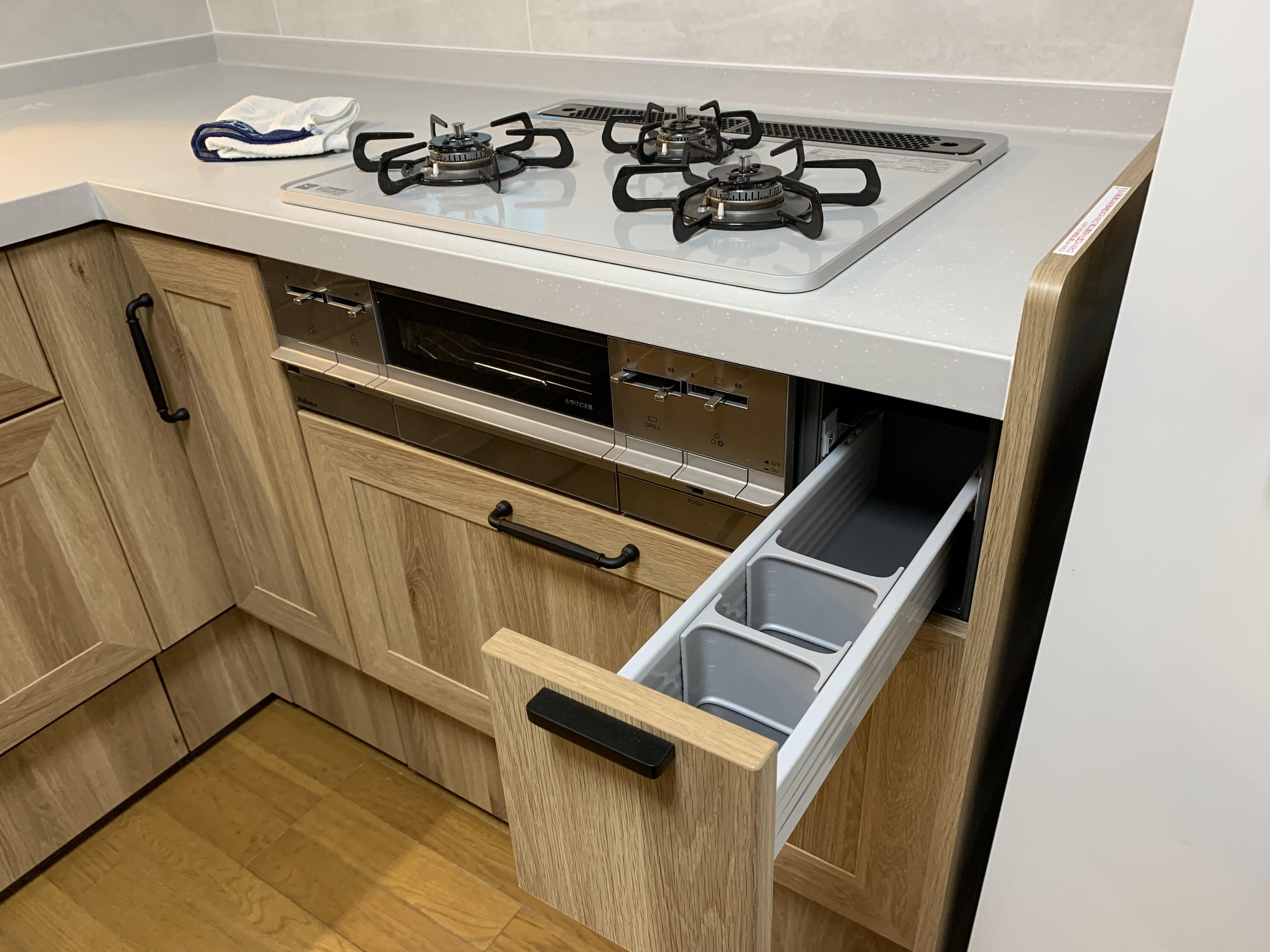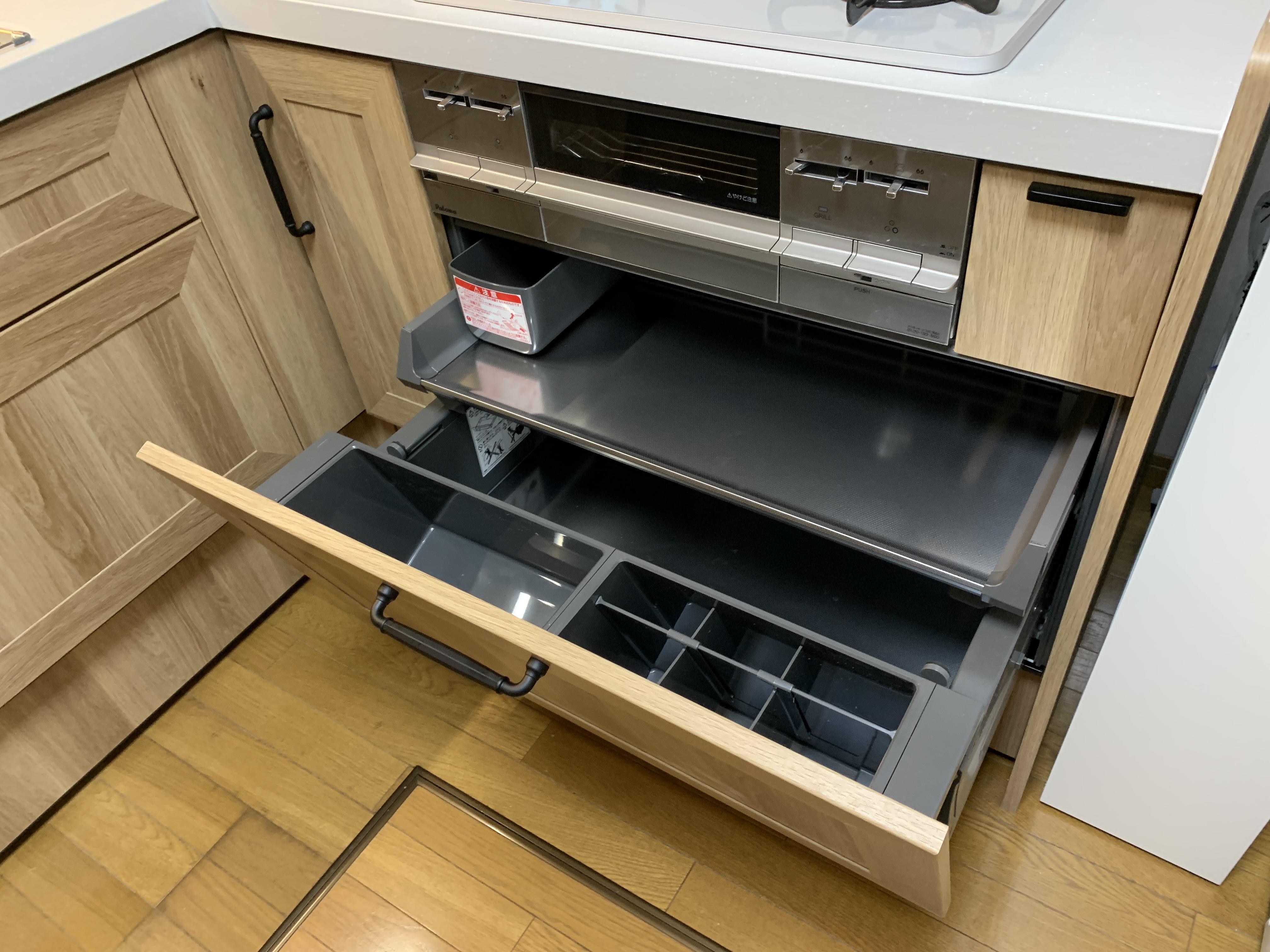 加熱調理機器の下も、同じく充実した収納スペースがあります。