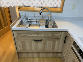 リシェルSI 20 扉カラー:ナチュラルオーク (上品な木目が印象的で、とってもおしゃれ)Wサポートシンク ステンレス排水シンク内の2段のレーンとプレートを使い、お料理の様々な作業が手際よく行えます。また、アフター写真のレンジフードはお掃除が楽なよごれんフードを採用。普段のお手入れはさっと一拭きで大丈夫です。レンジフードの面材も扉カラーに合わせましたので、レンジフードが付いているのかと思うほどです!!