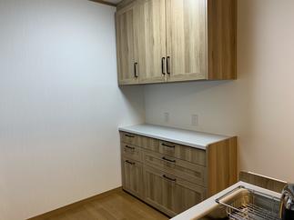 食器棚を撤去して、キッチンの扉カラーに合わせた収納カウンターと収納吊戸棚を設置ました。トータルでコーディネイトされていて、とっても素敵なキッチンです。