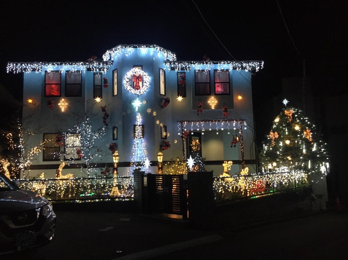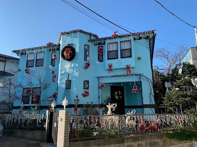 イルミネーションを設置しました。毎年にぎやかなイルミネーションを飾り、楽しんでいらっしゃるようですが、今年は外壁の水色に赤のサンタや、ライティングが映えて、一段と煌びやかですね!