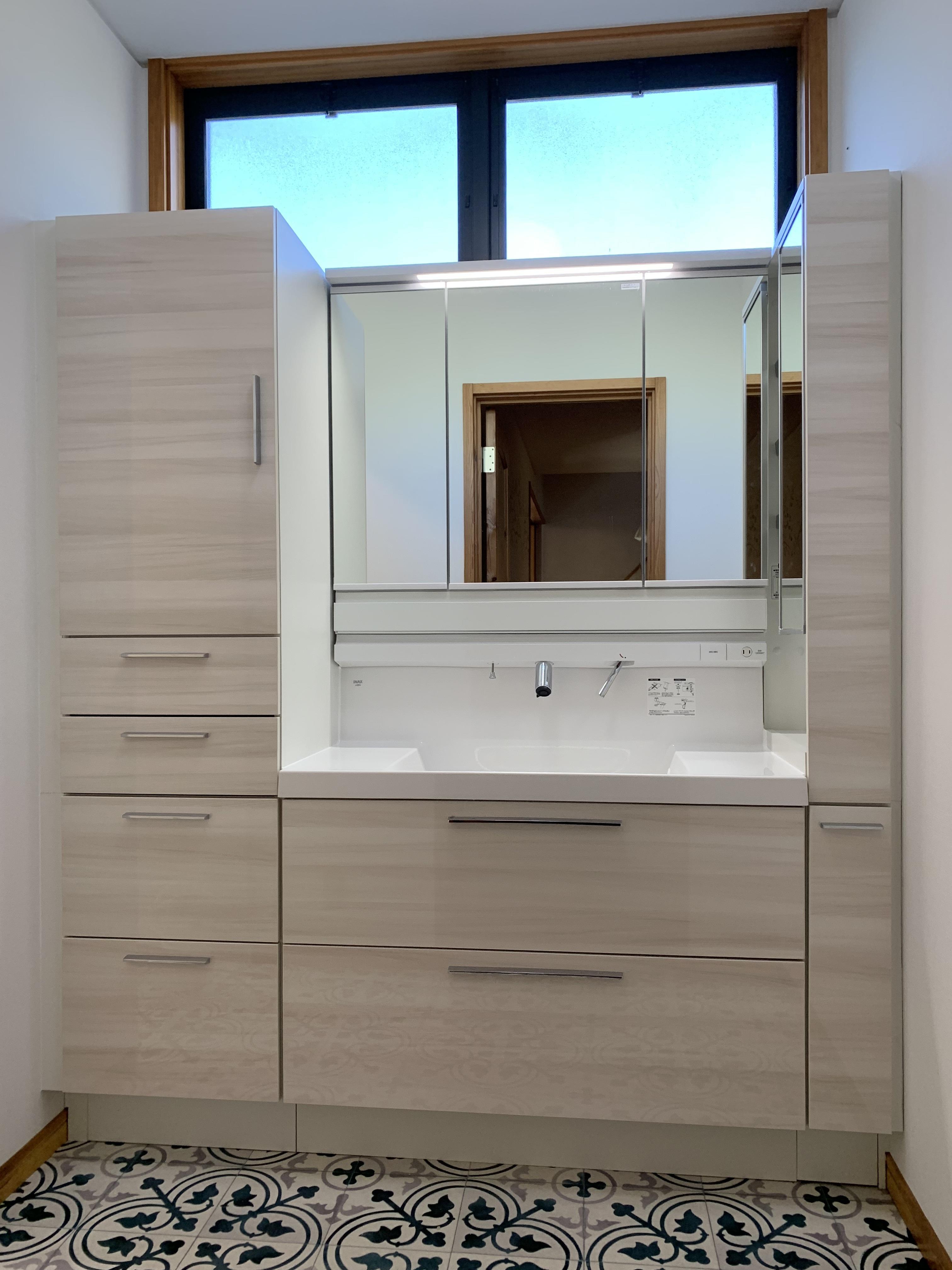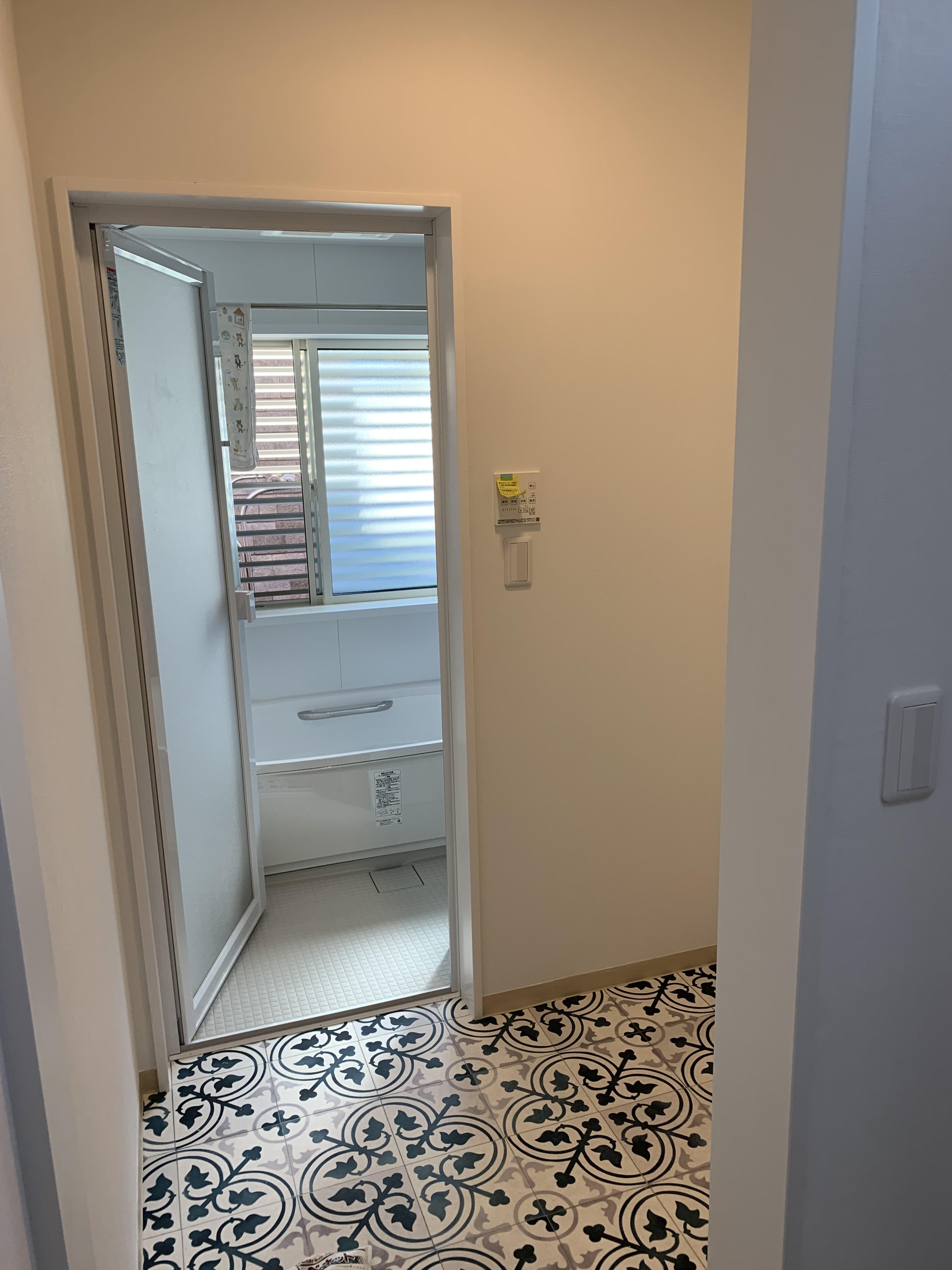 浴室をコンパクトにしたことによって出来たスペースに、脱衣室を造りました。洗面室の床と同じ柄で合わせ、つながりを感じつつ、独立したスペースを設置したことにより、各箇所がスッキリとしました。