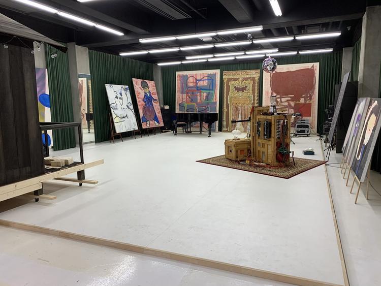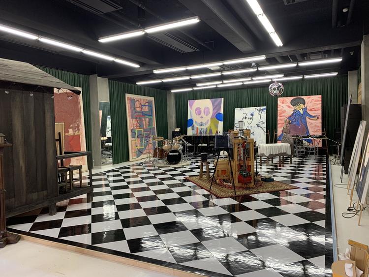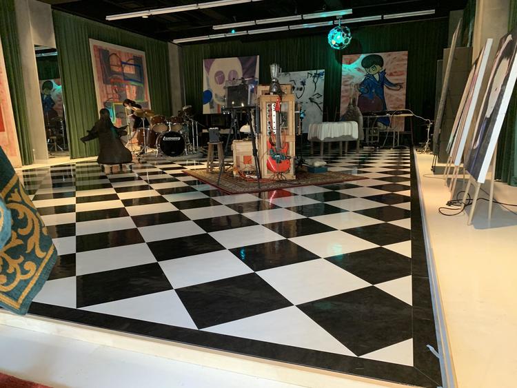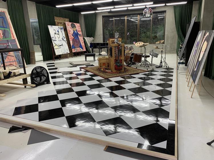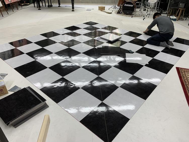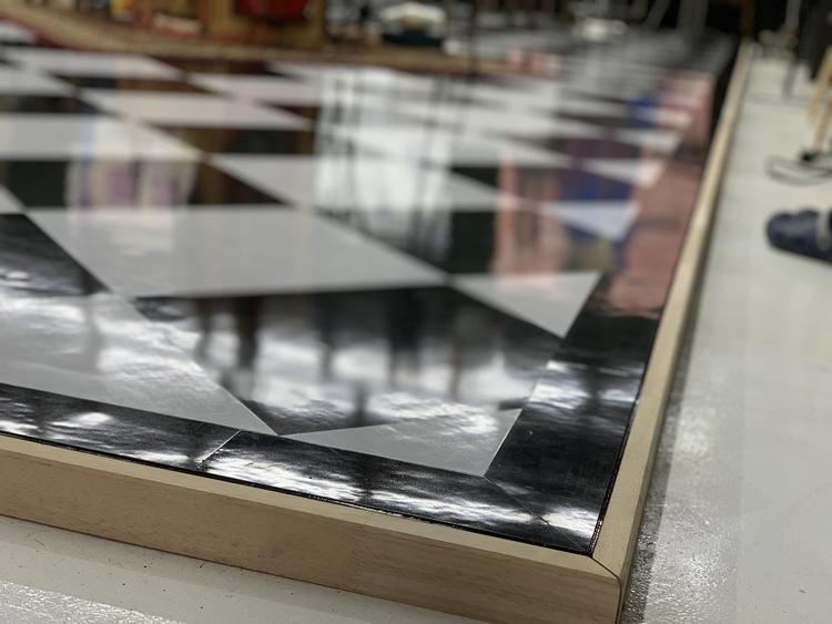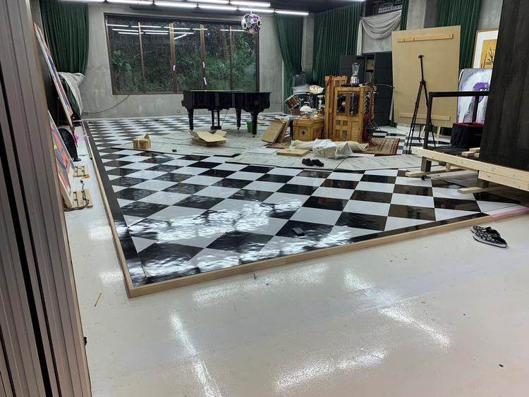 お客様のご要望でハーリキンチェック柄になるように、東リのフロアタイル450角のモノで仕上げました。 四方は同じ黒のフロアタイルで、縁を回しました。 左側に小屋も移動しながら工事を行うので、ジャッキで起こして車輪を付けて移動出来るようにしました。