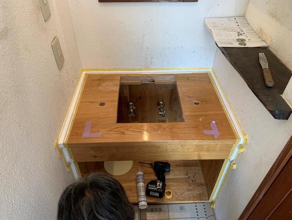 既存のボウル用に、造作カウンターの排水は50φくらいしか穴が開いていなかったので